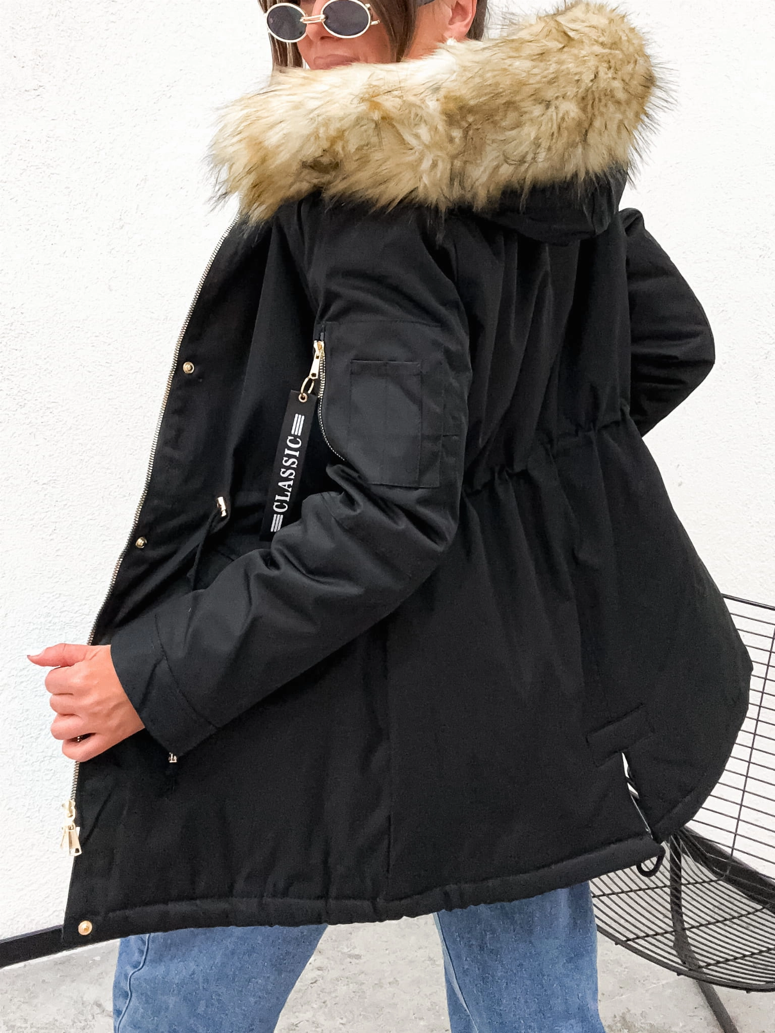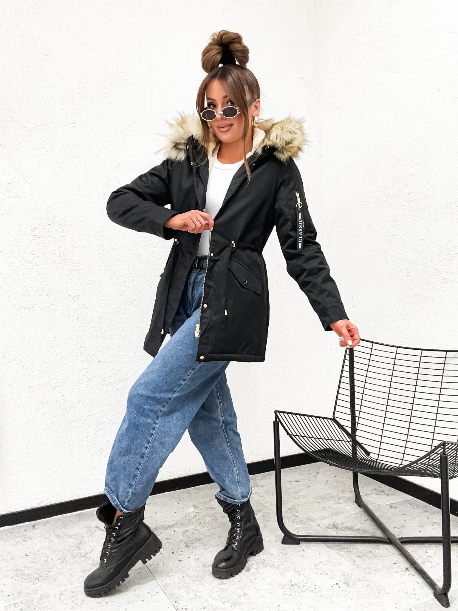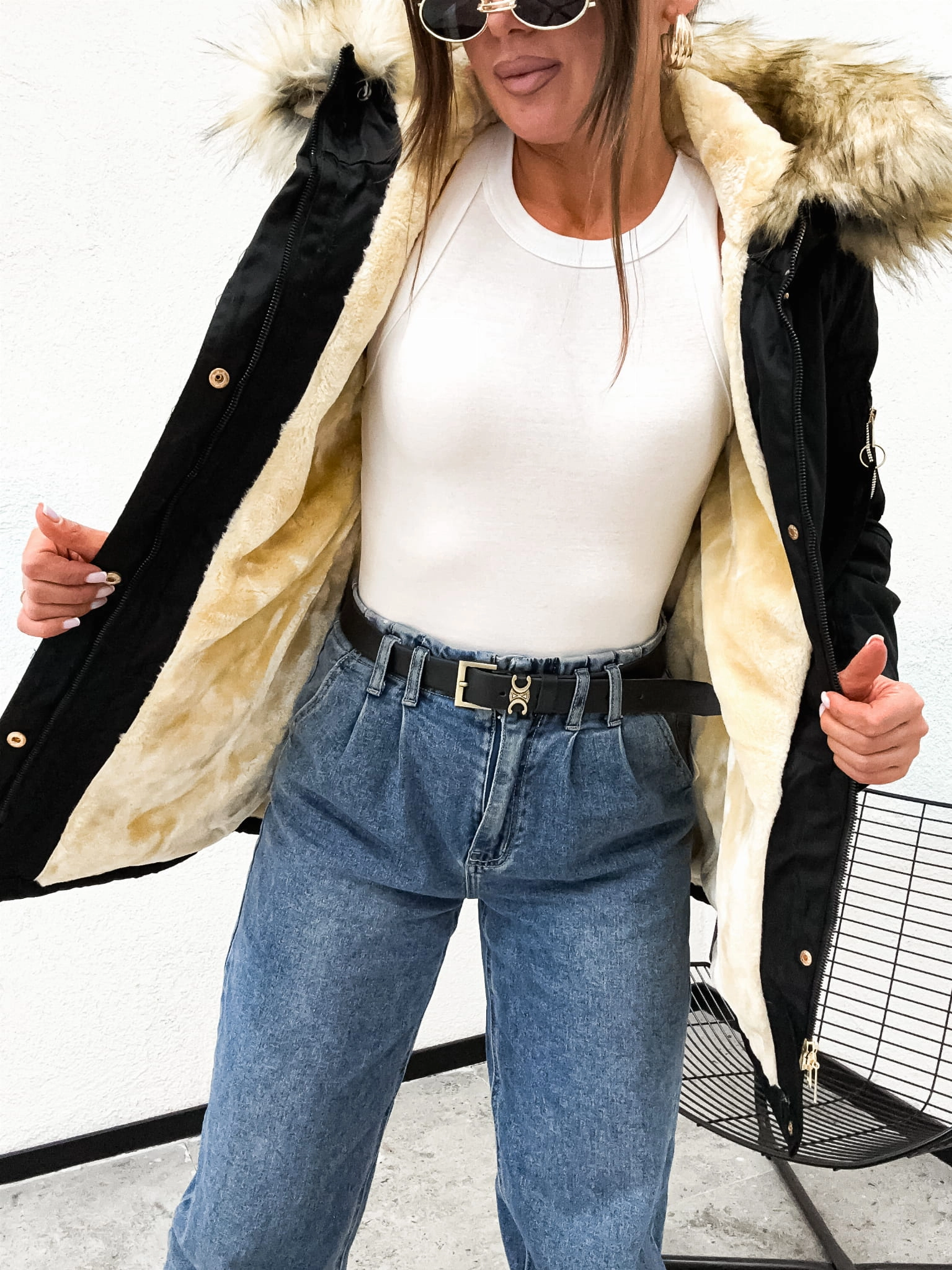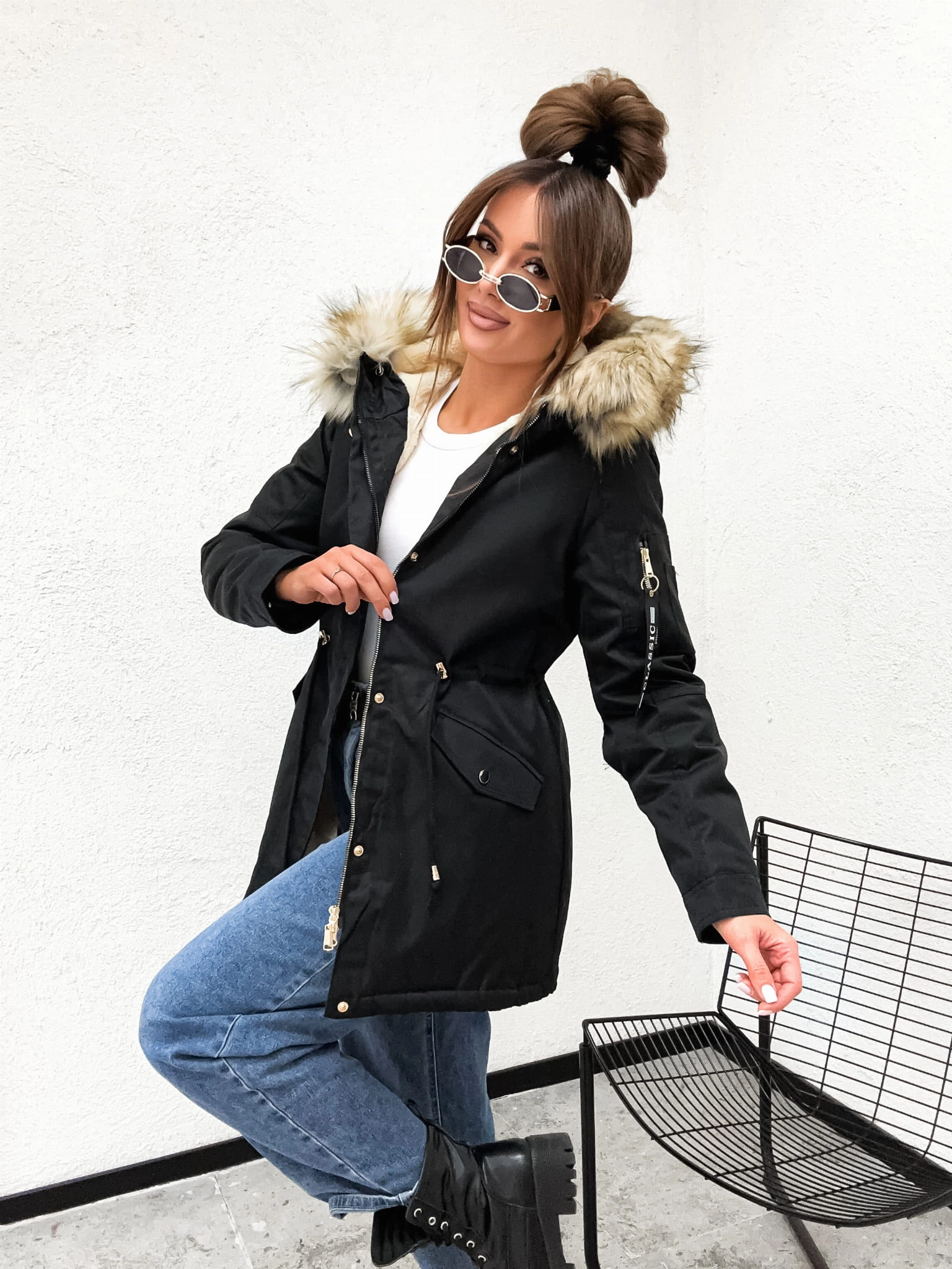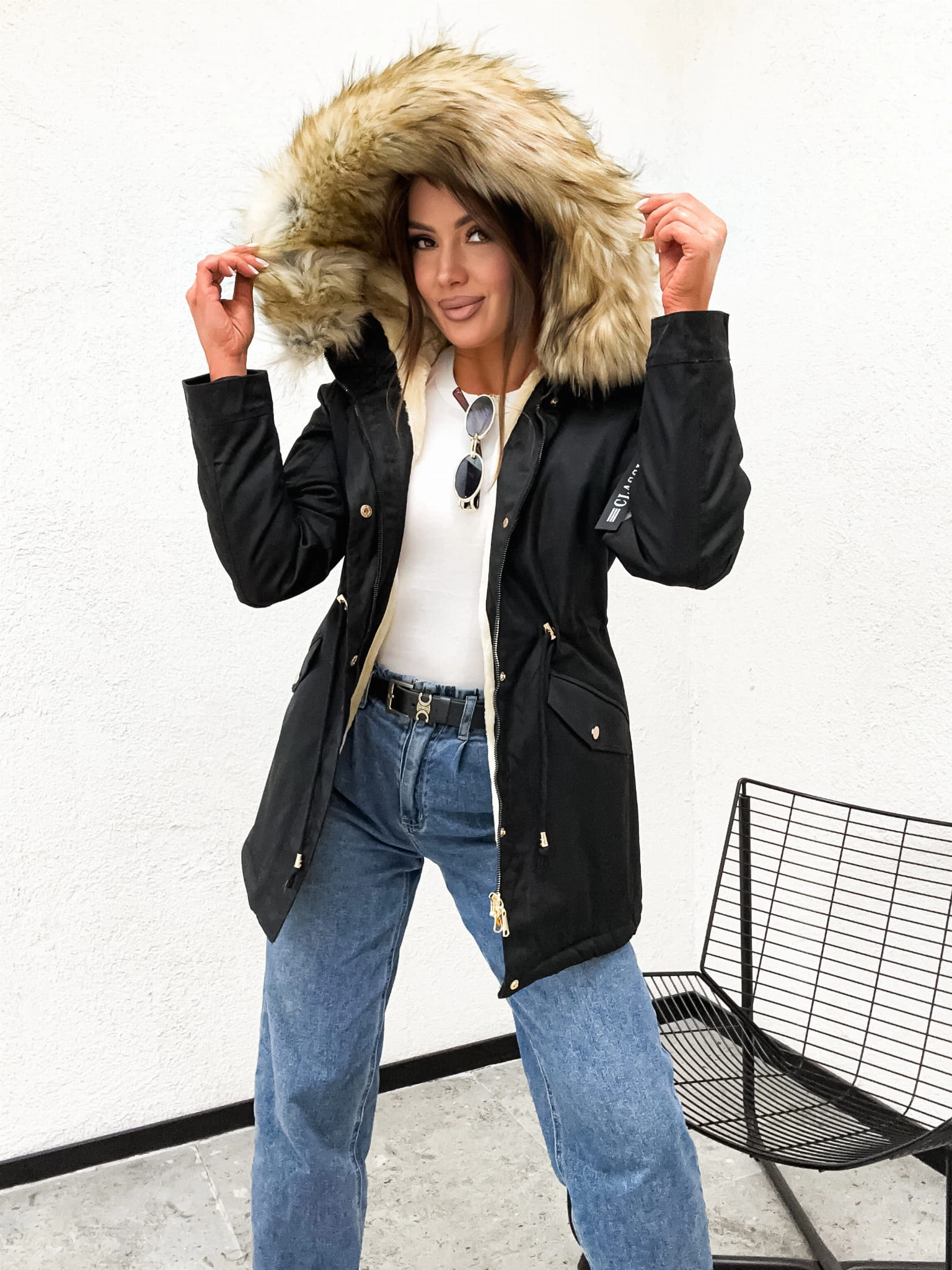 Ciepła zimowa kurtka damska PARKA na misiu 8556 - CZARNA beż