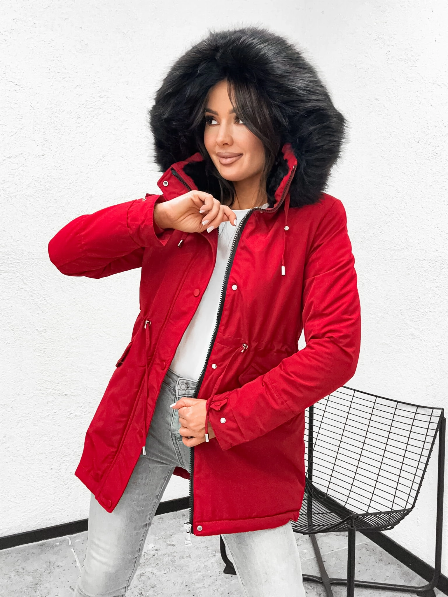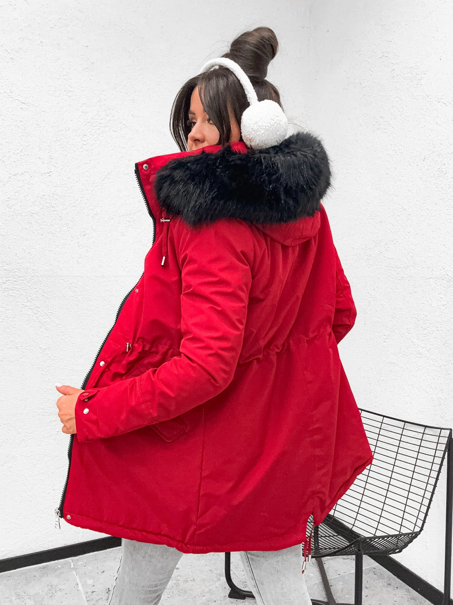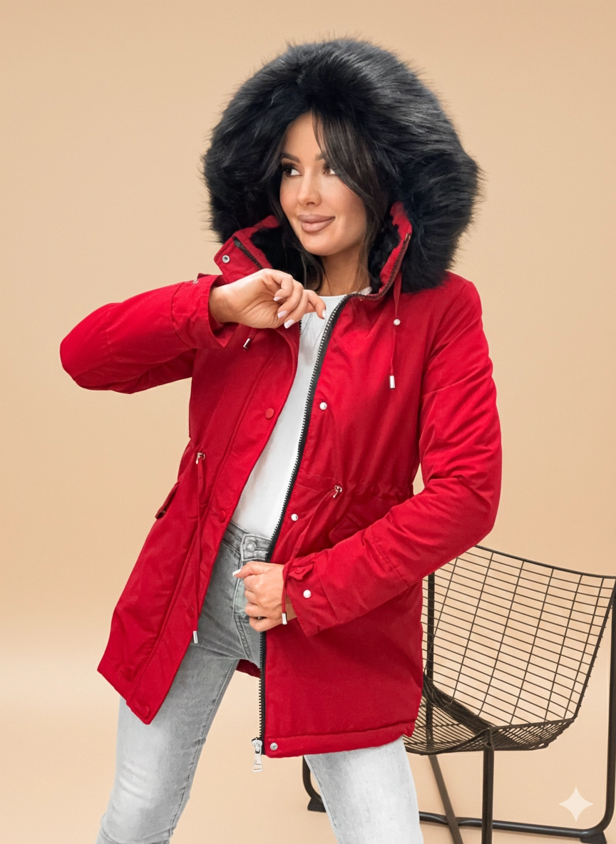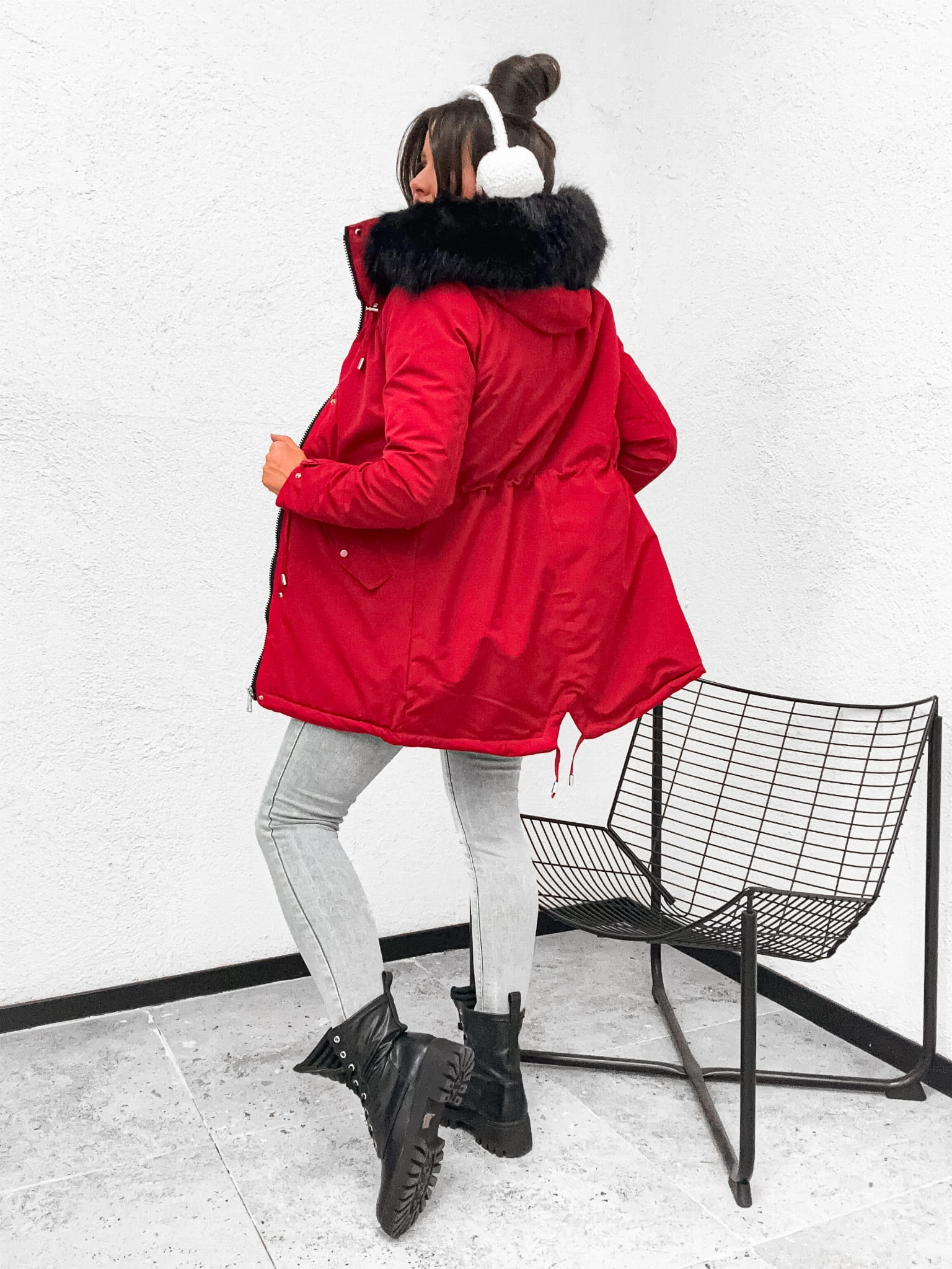 Ciepła zimowa kurtka damska PARKA z misiem W610 - CZERWONA z czarnym