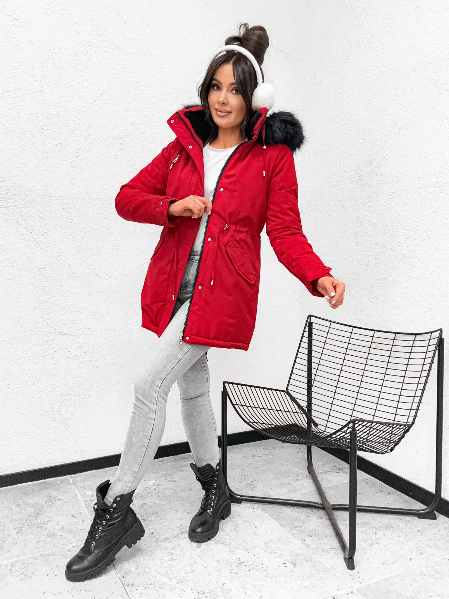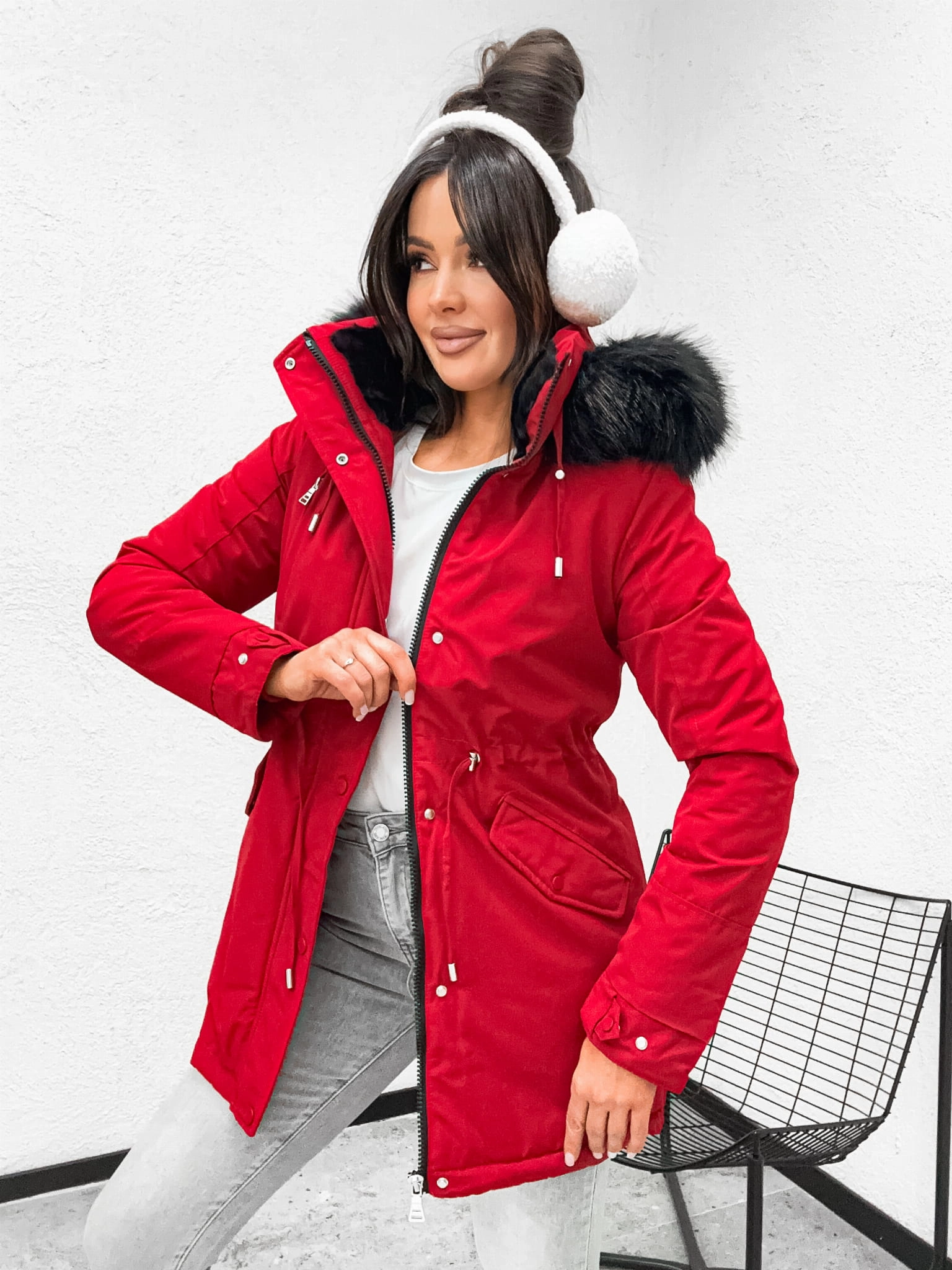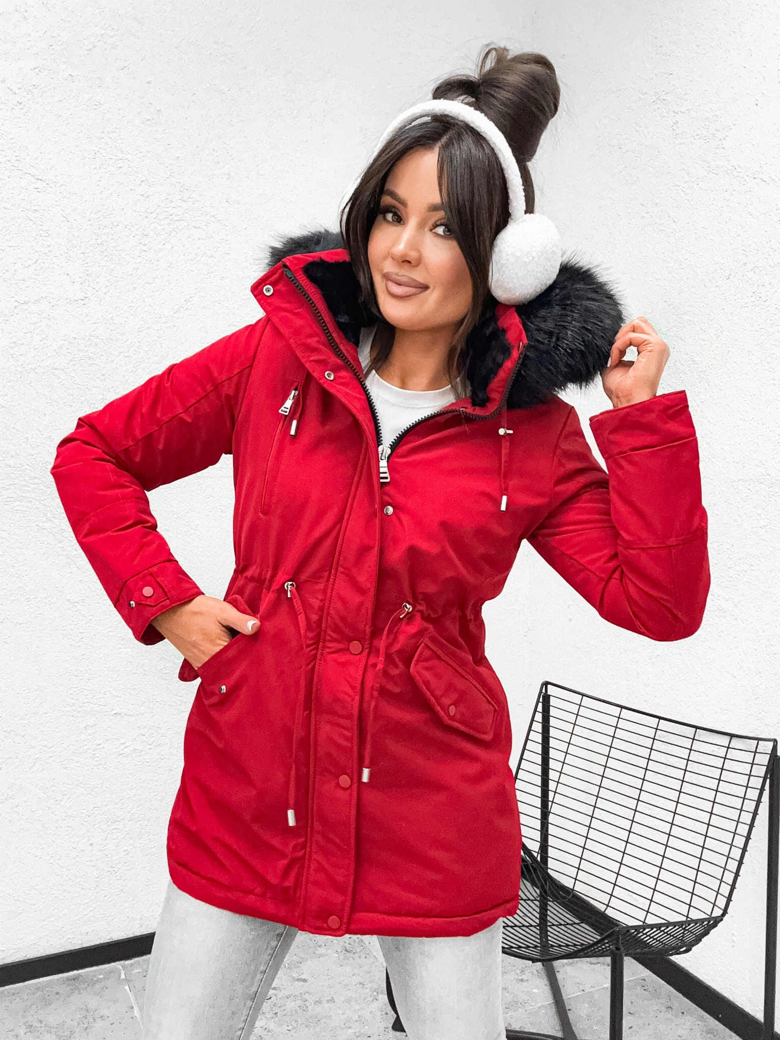 Ciepła zimowa kurtka damska PARKA z misiem W610 - CZERWONA z czarnym