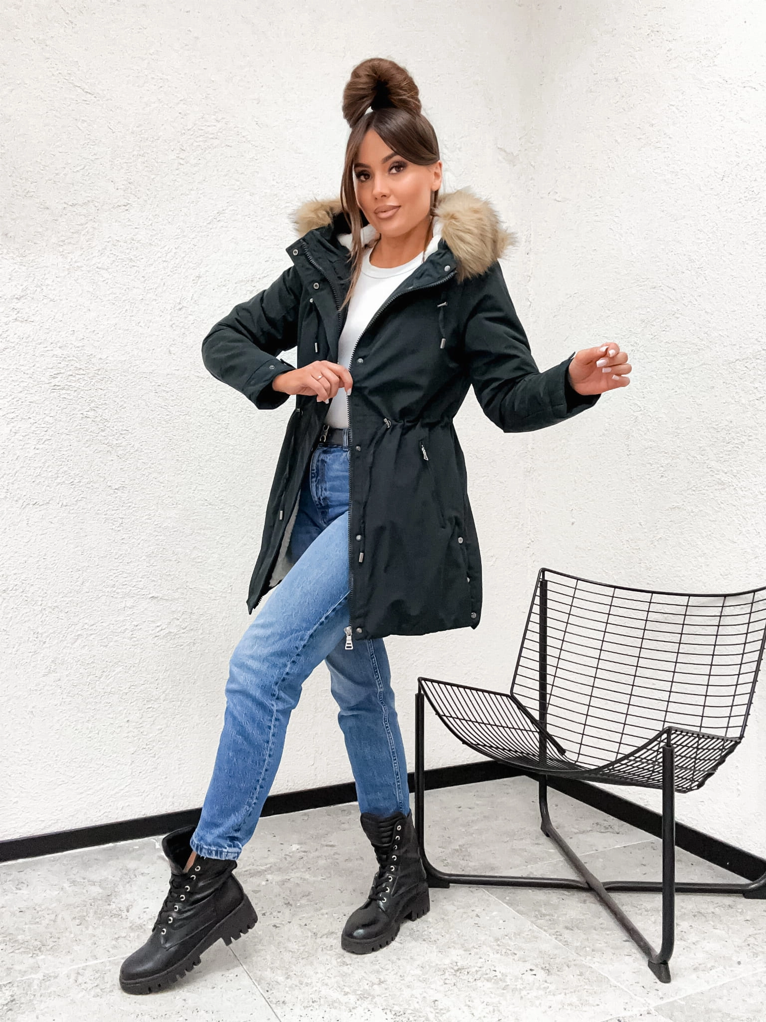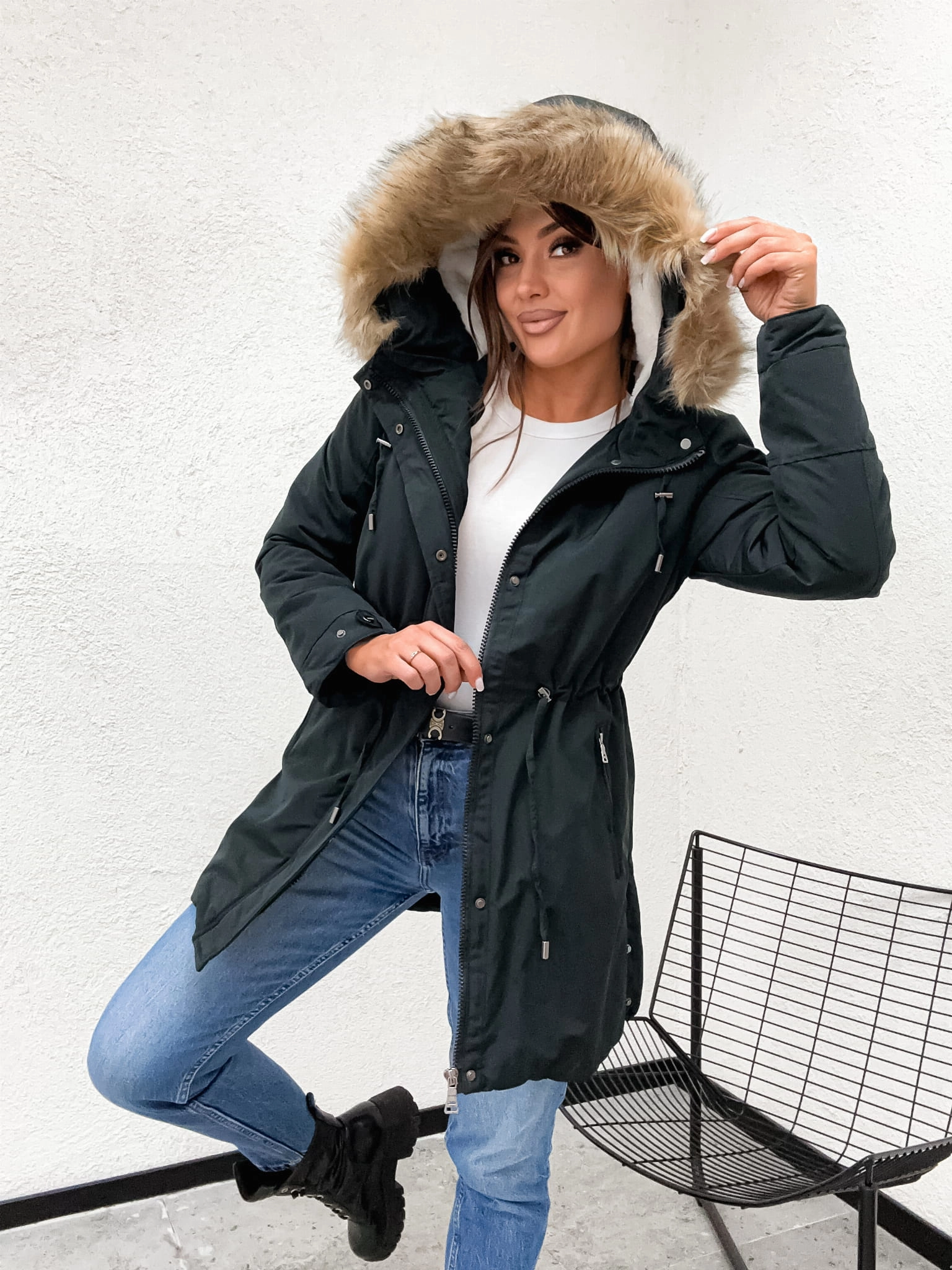 Nasza ciemnoszara parka została wyposażona w detale, które zwiększają jej praktyczność i pozwalają na idealne dopasowanie do sylwetki: