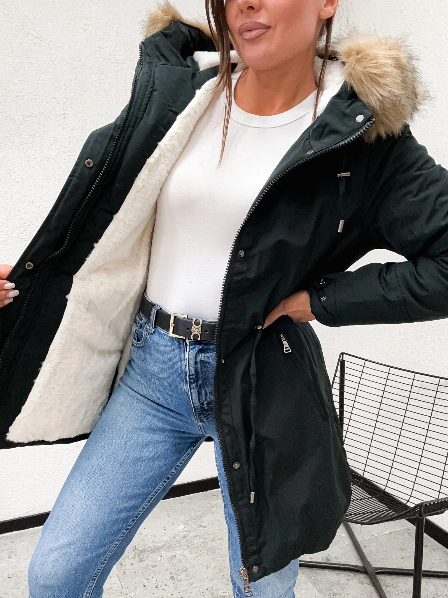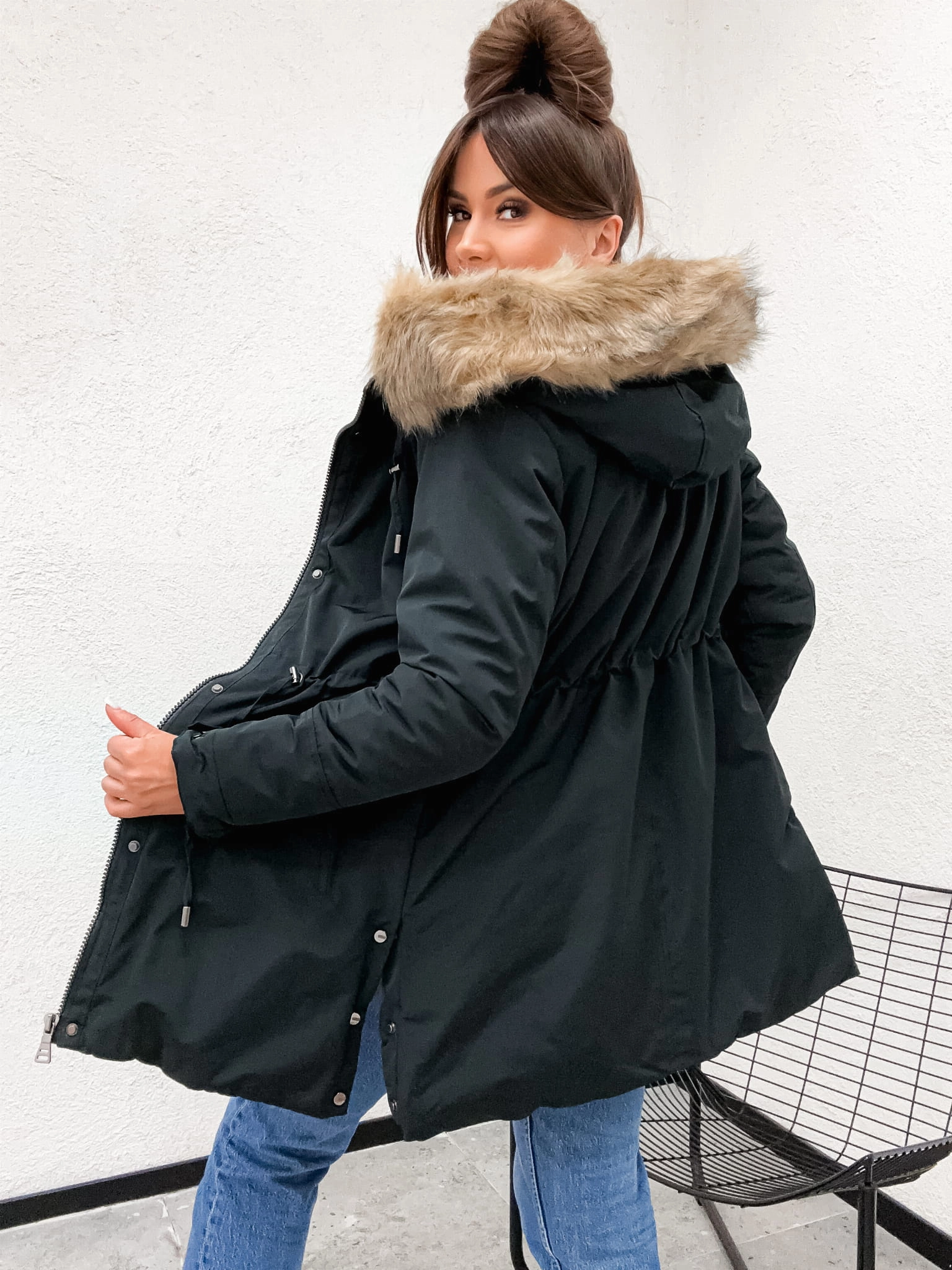 Luksusowe Wnętrze: Cały korpus kurtki (i kaptur) są podszyte mięciutkim i grubym futerkiem (zwanym popularnie misiem). Ta puszysta warstwa działa jak naturalny izolator, gwarantując zatrzymanie ciepła przy ciele.