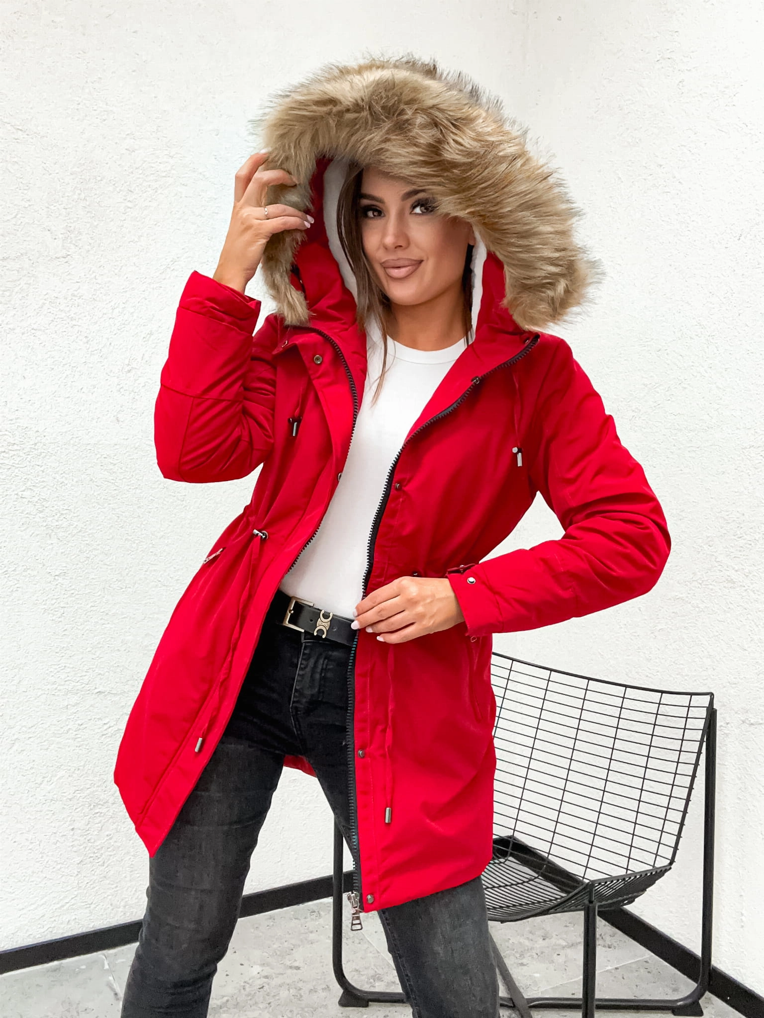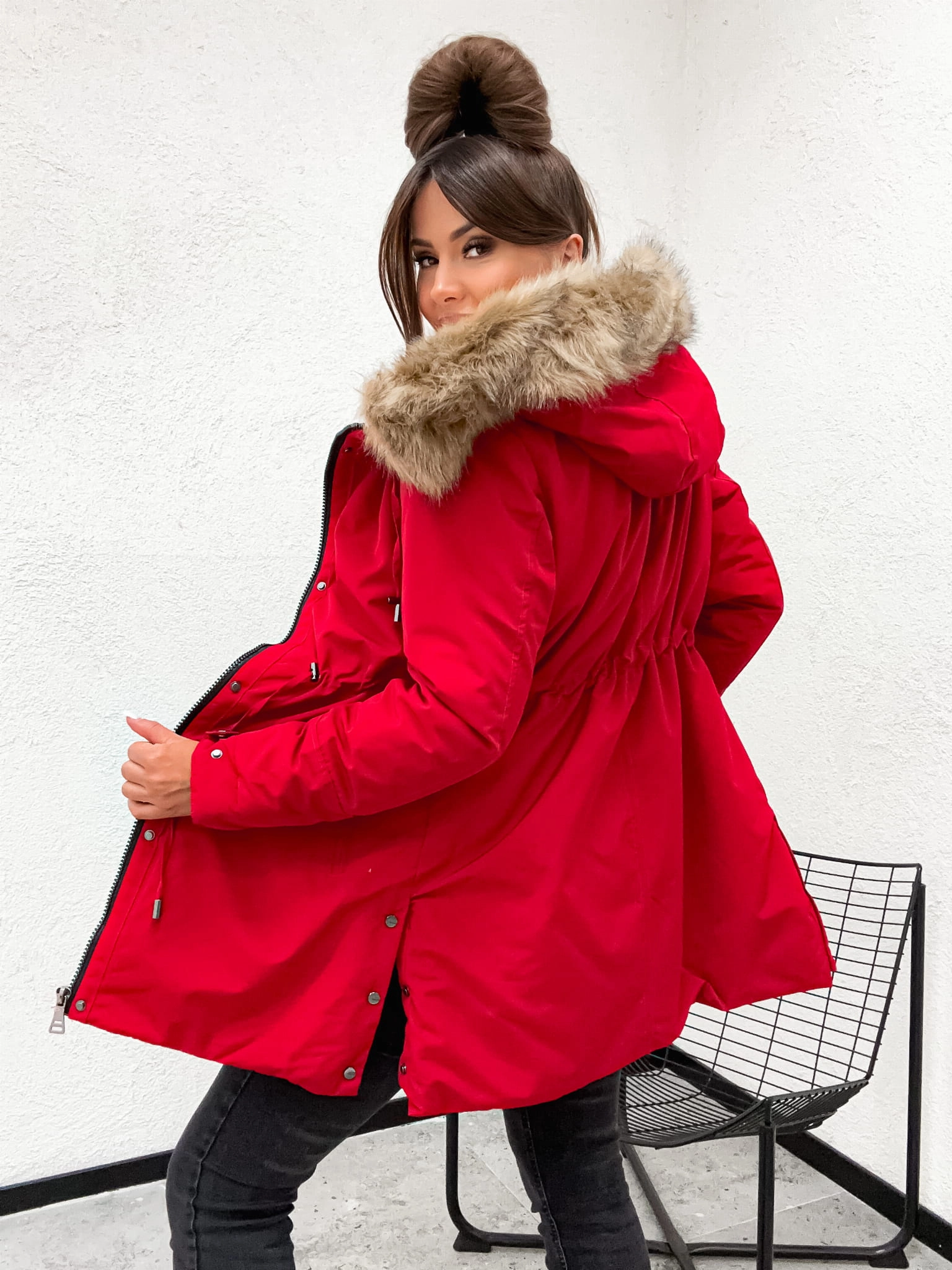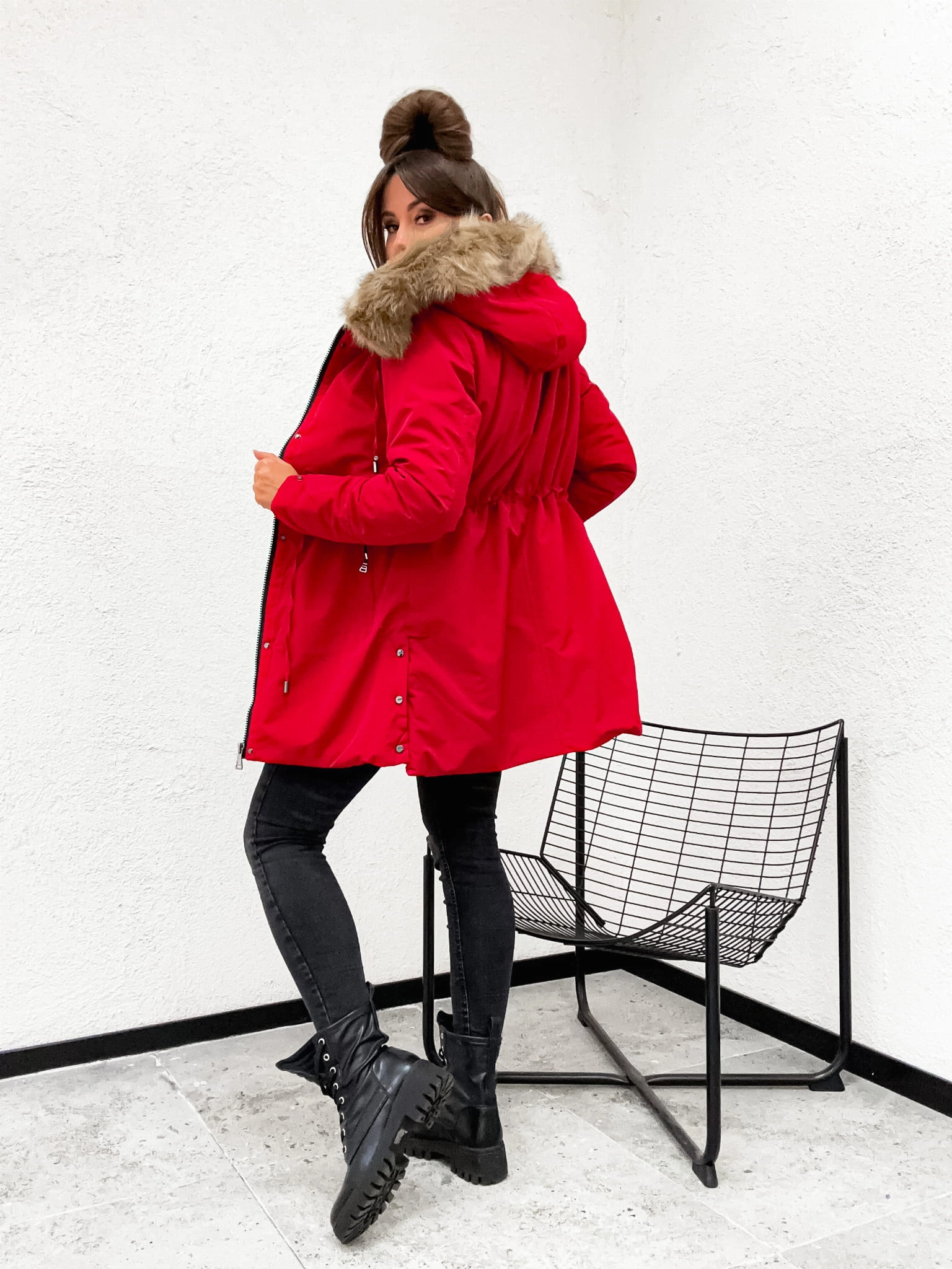 Ciepła zimowa kurtka damska PARKA z misiem W620 - CZERWONA z brązem