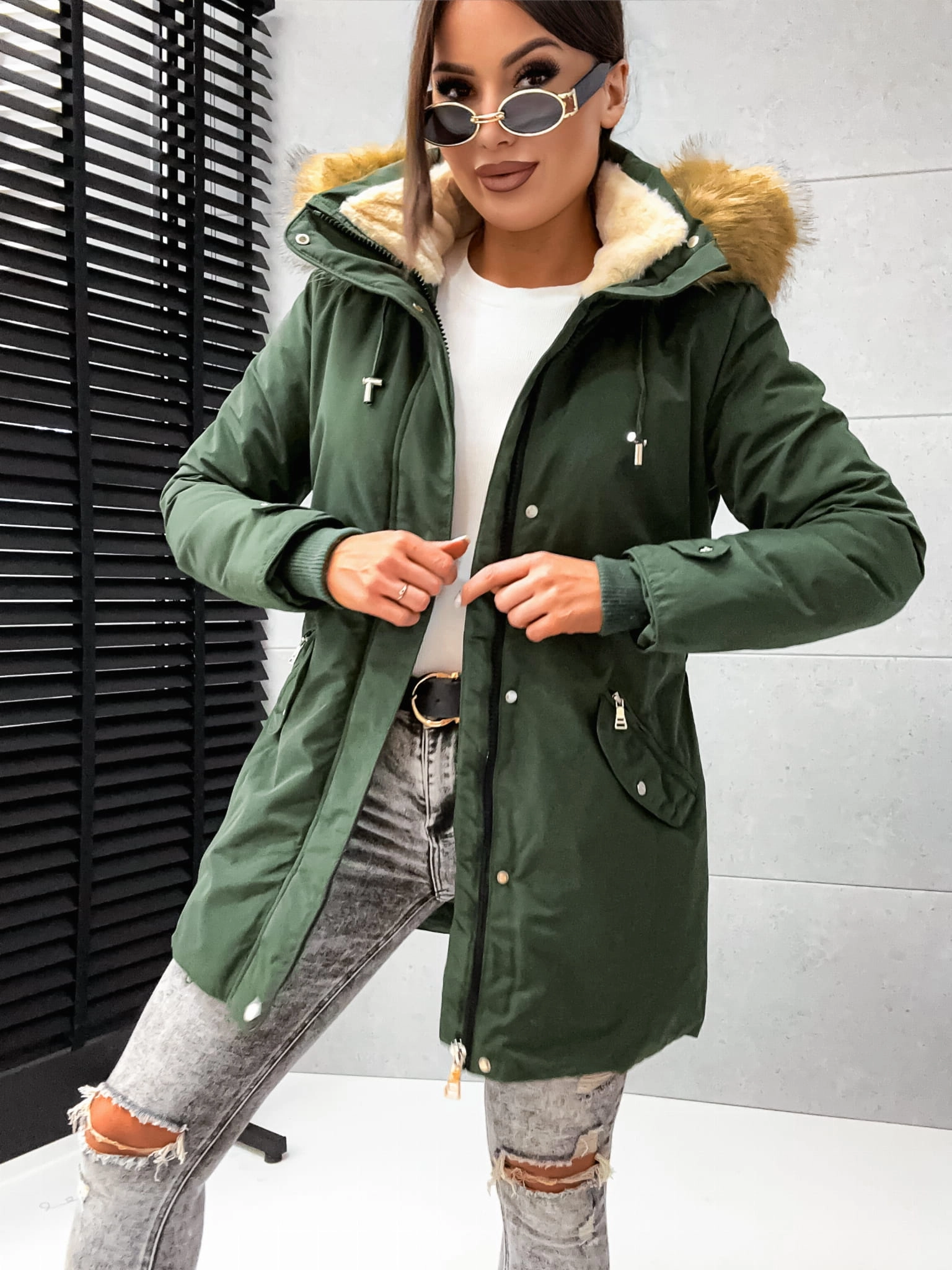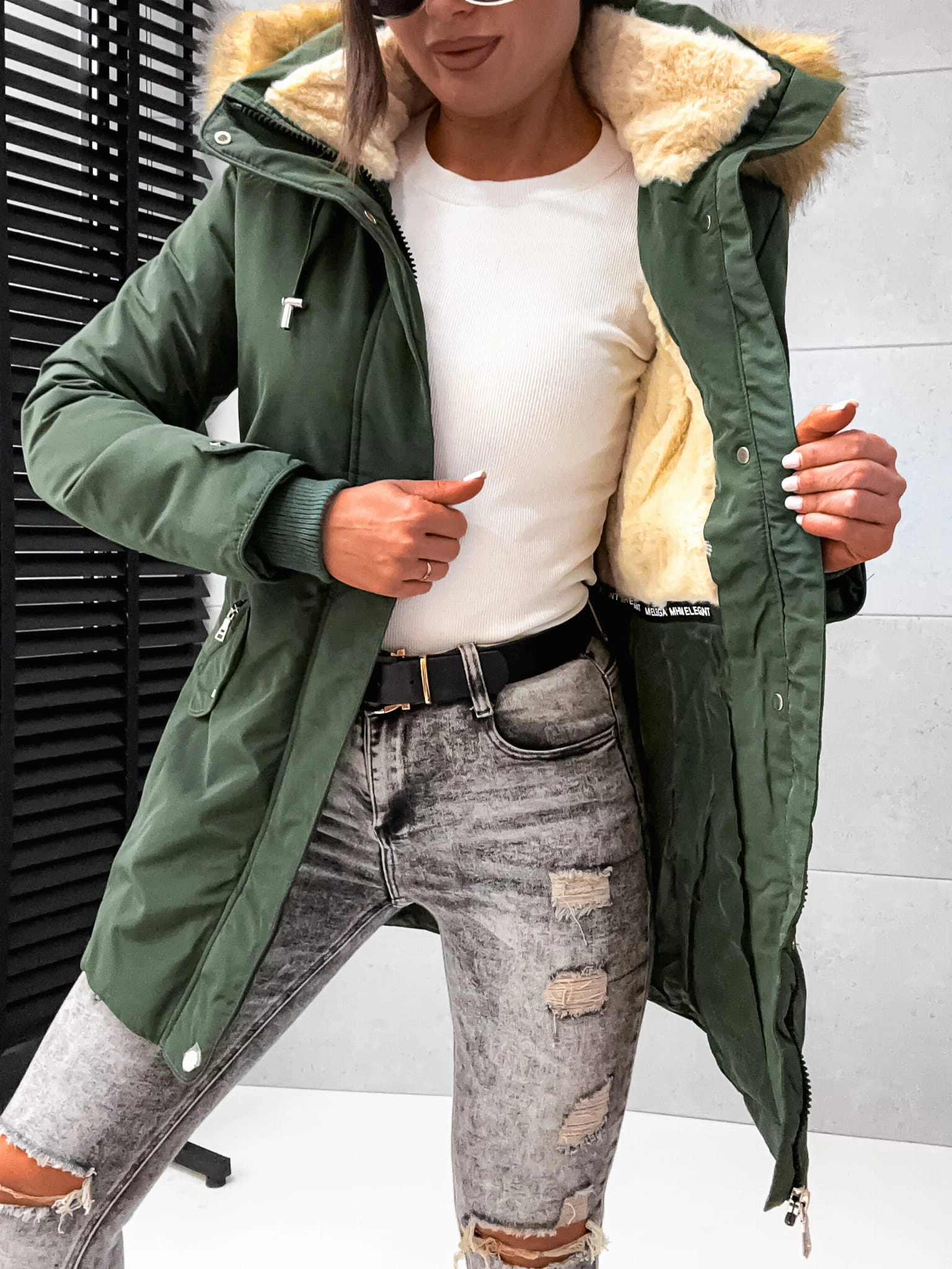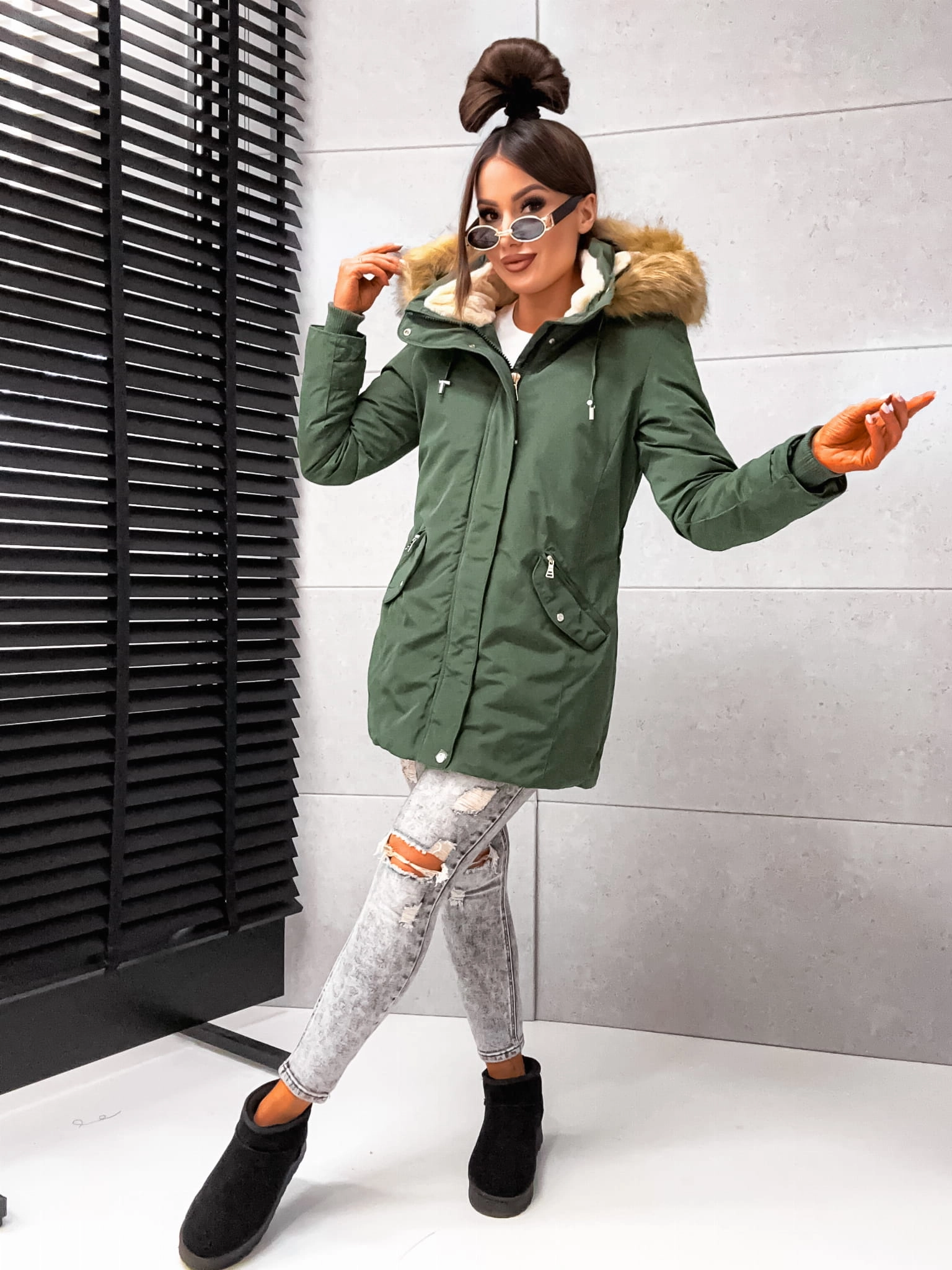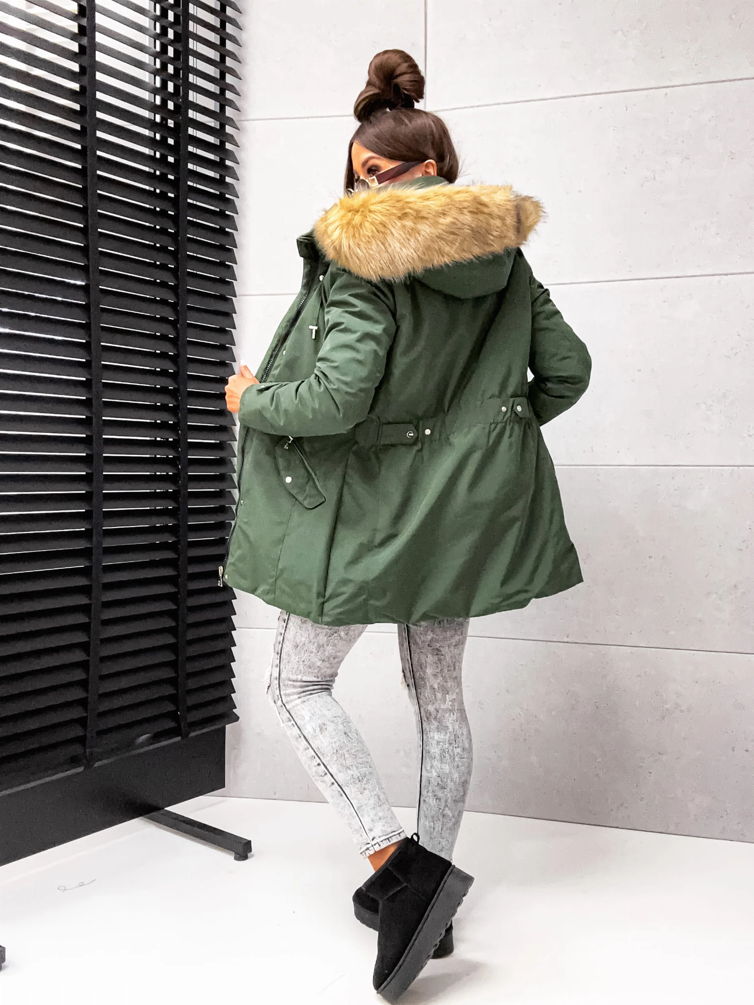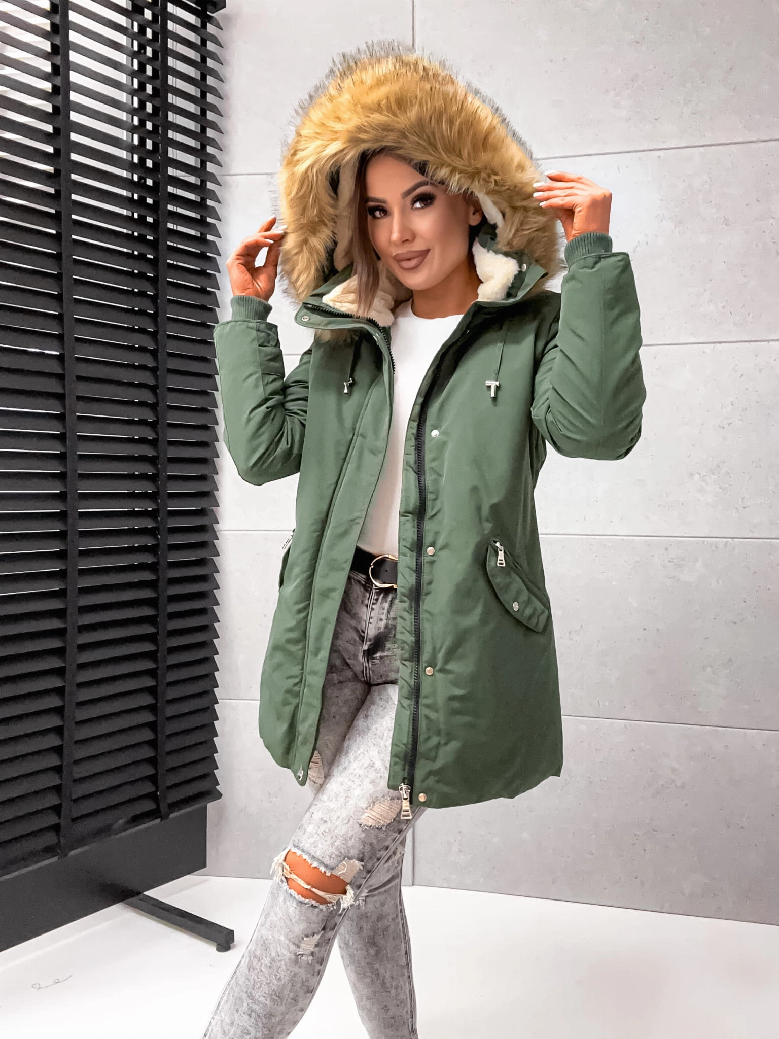 Ciepła zimowa kurtka damska PARKA z misiem W631 - ZIELONA z brązem