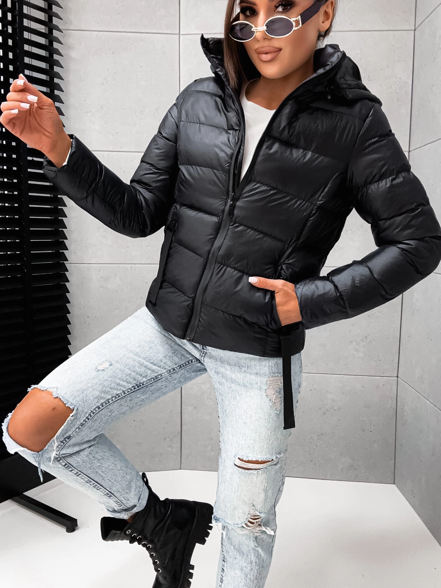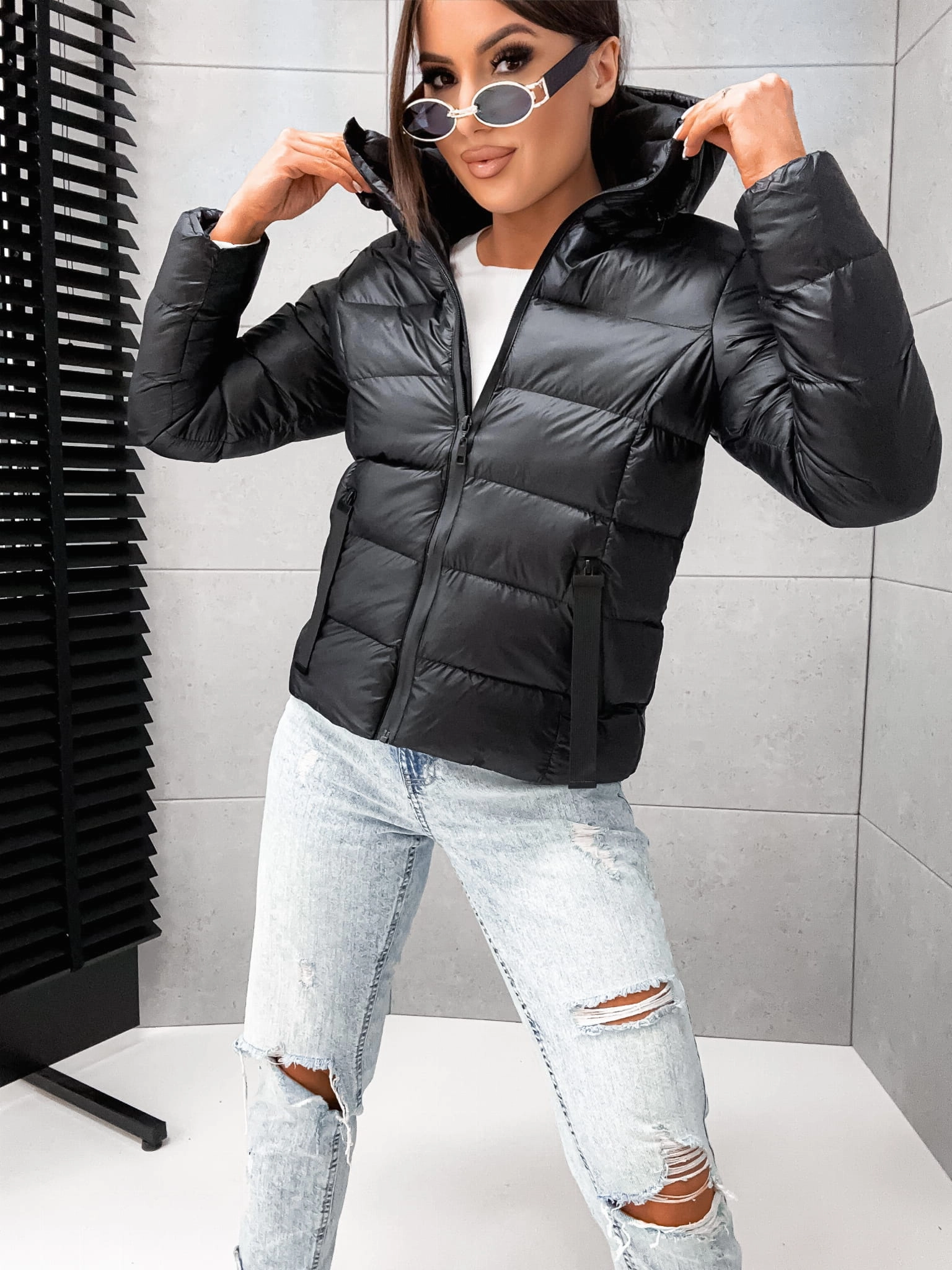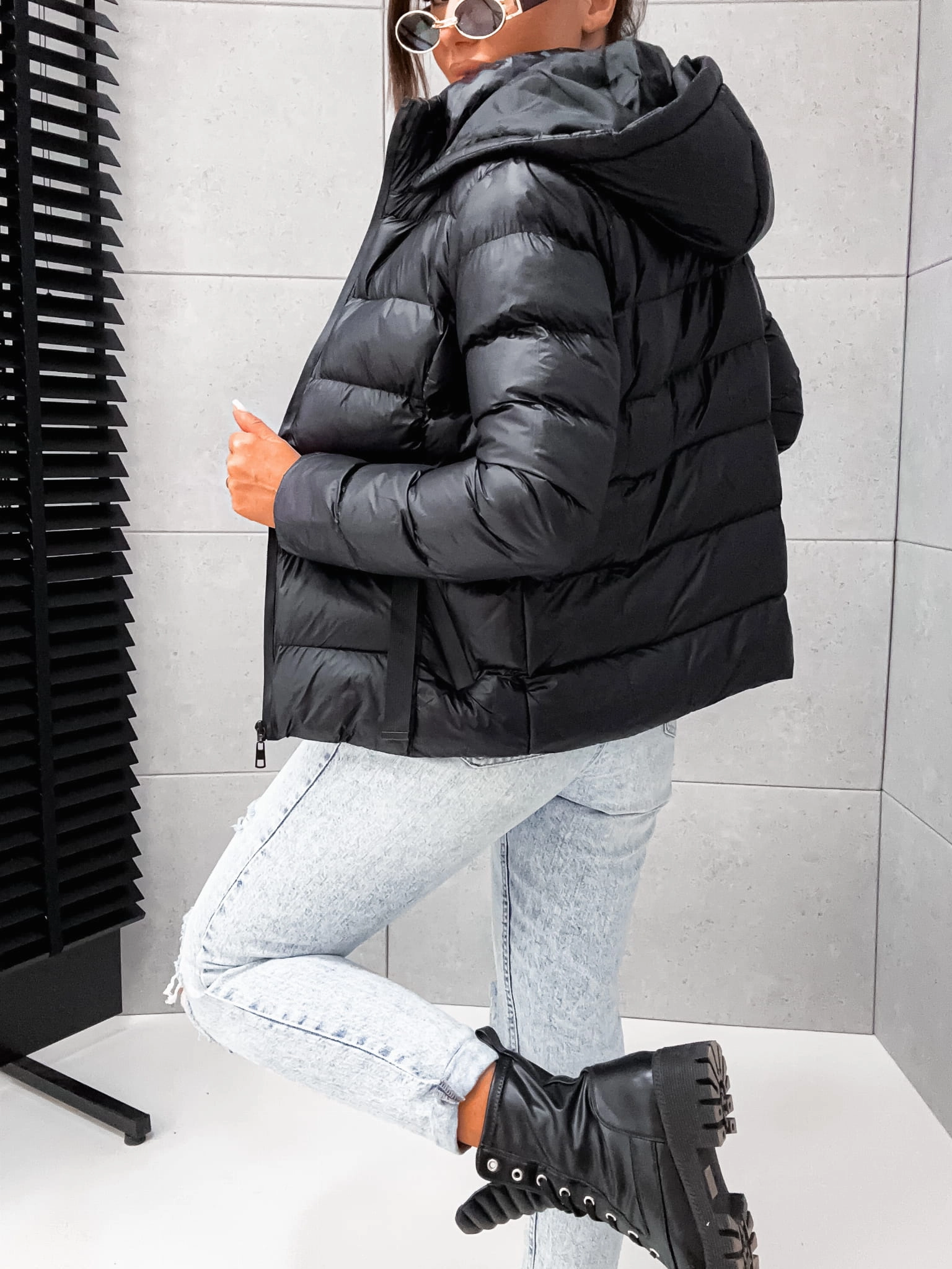 Czarna jesienno- zimowa kurtka damska z ociepleniem, idealna na chłodne dni. Z kapturem i dwiema praktycznymi kieszeniami. Stylowo i komfortowo!