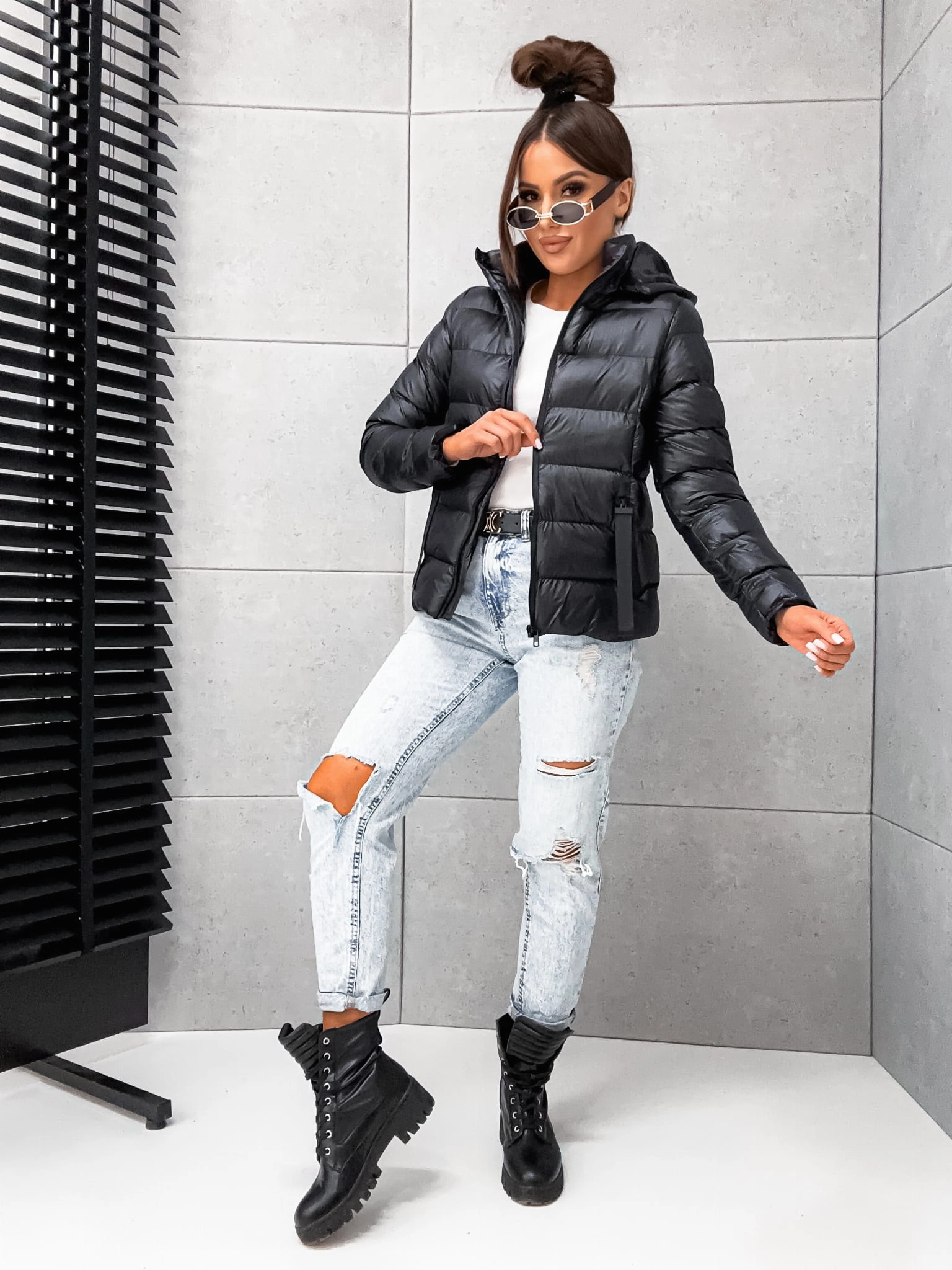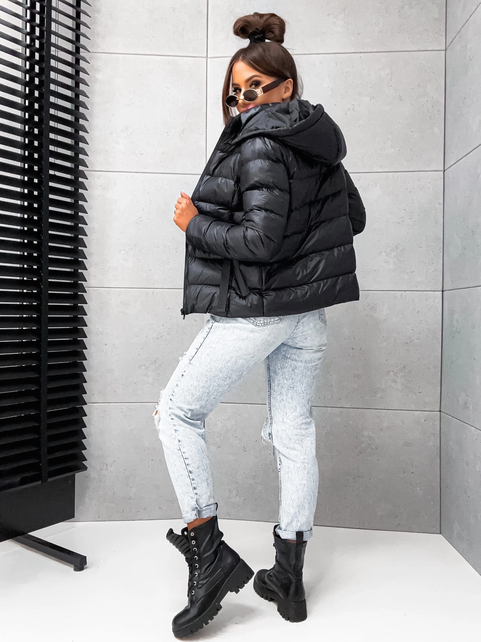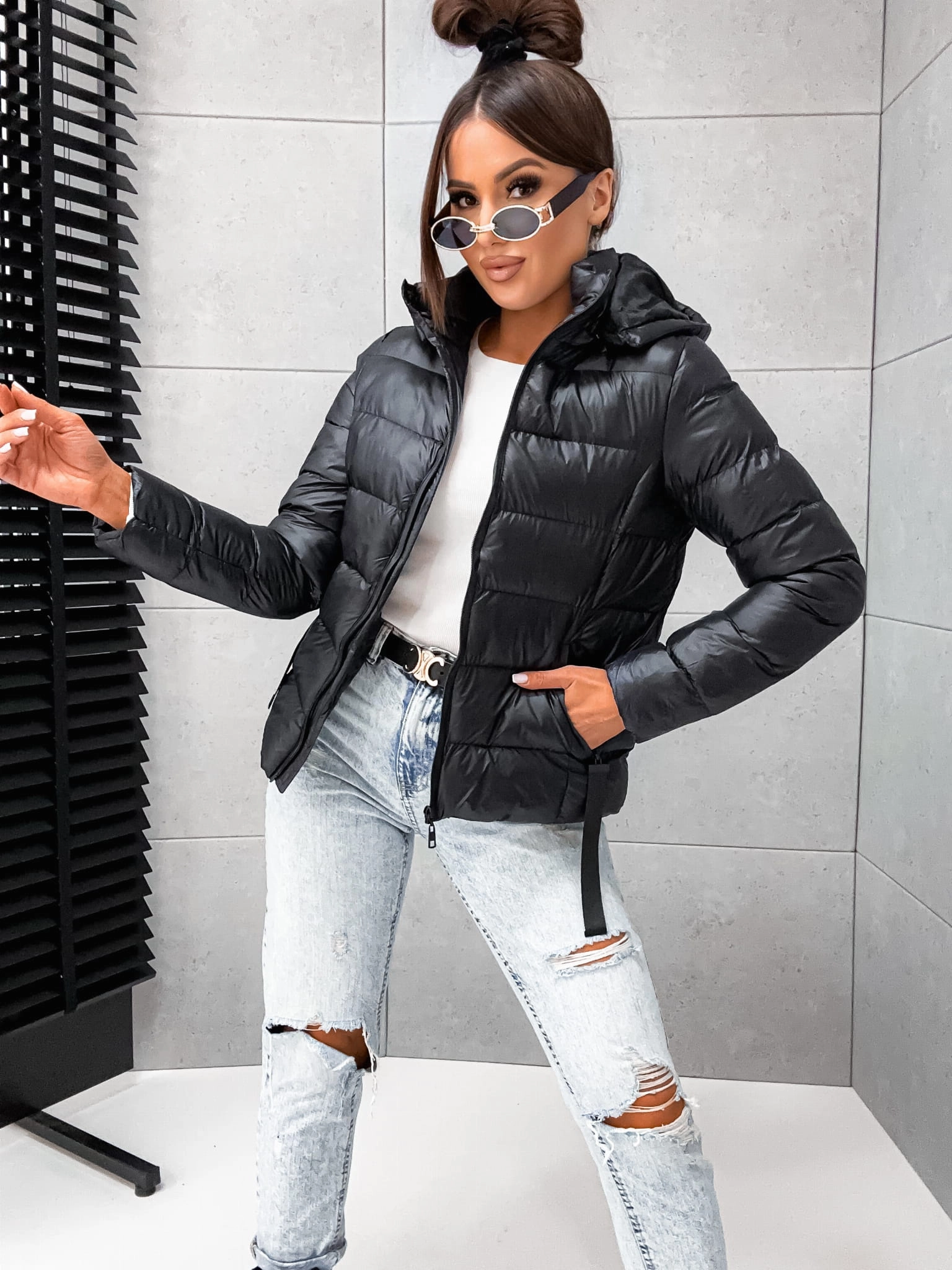 Czarna jesienno- zimowa kurtka damska z ociepleniem, idealna na chłodne dni. Z kapturem i dwiema praktycznymi kieszeniami. Stylowo i komfortowo!