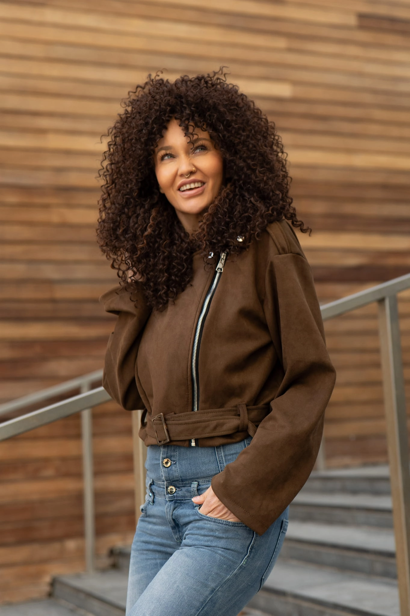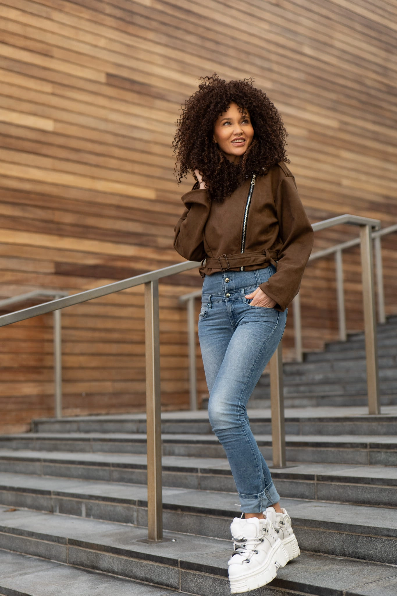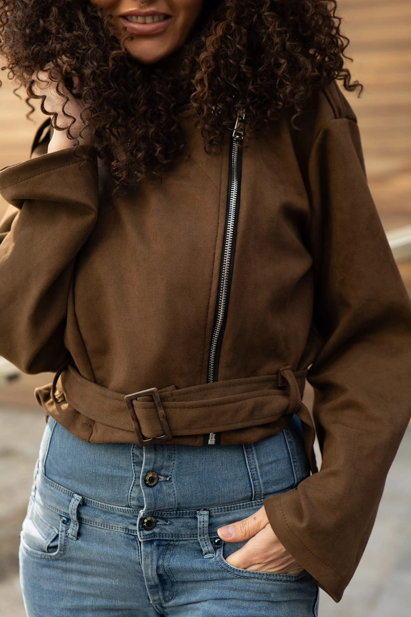 Brąz to jeden z najmodniejszych kolorów sezonu, który dodaje stylizacjom ciepła i elegancji. Nasza zamszowa ramoneska świetnie komponuje się zarówno z jasnymi, zwiewnymi sukienkami, jak i klasycznymi jeansami czy białą koszulą. Brak ocieplenia sprawia, że jest to niezwykle lekka propozycja, która nie obciąża sylwetki, a jednocześnie chroni przed wiosennym wiatrem.