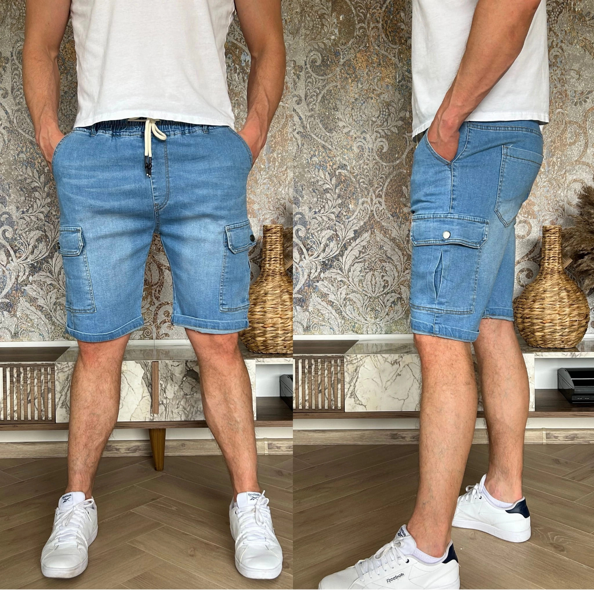 Meskie krotkie spodenki bojowki jeansowe na gumie 8260 - niebiskie
