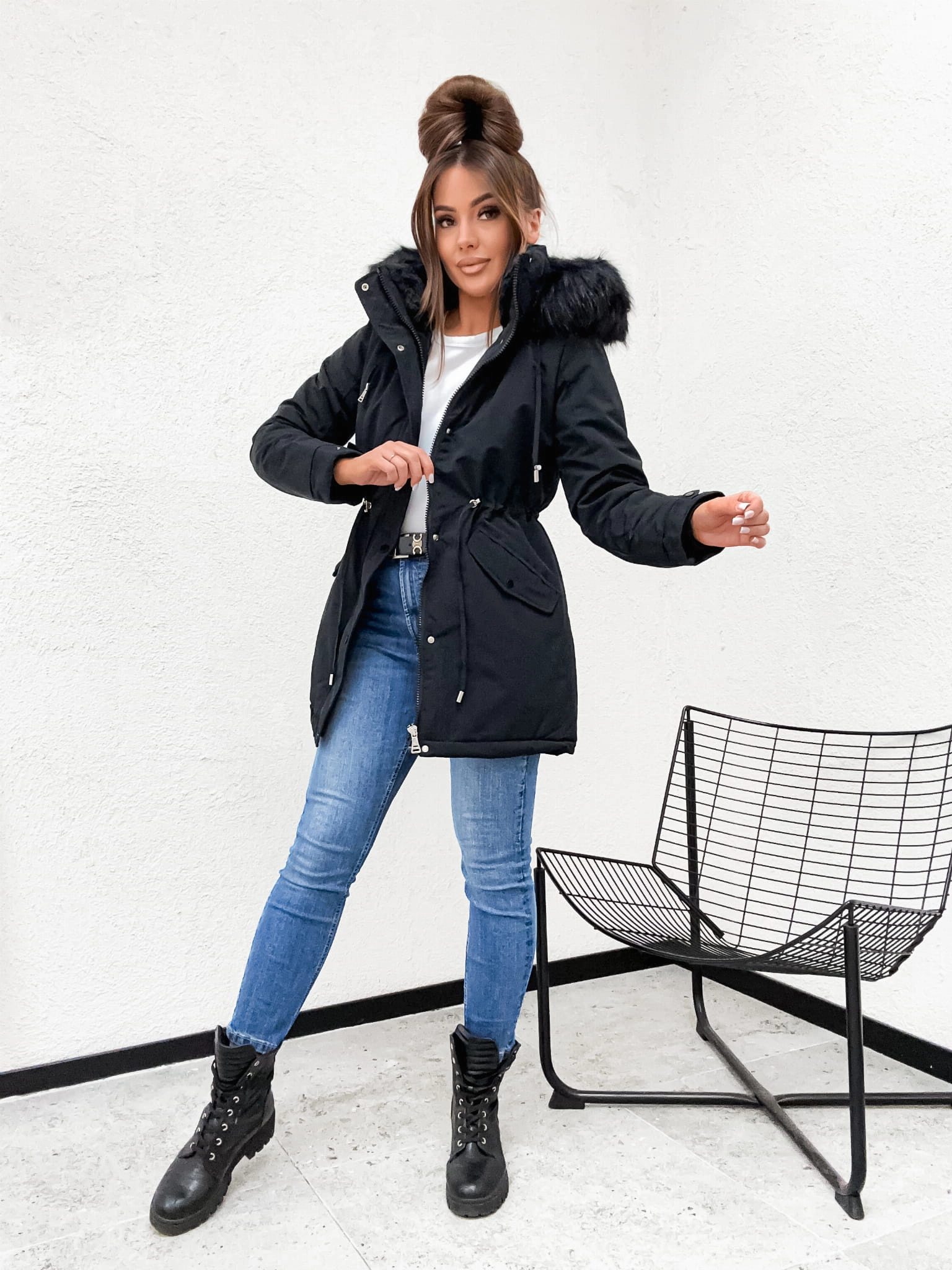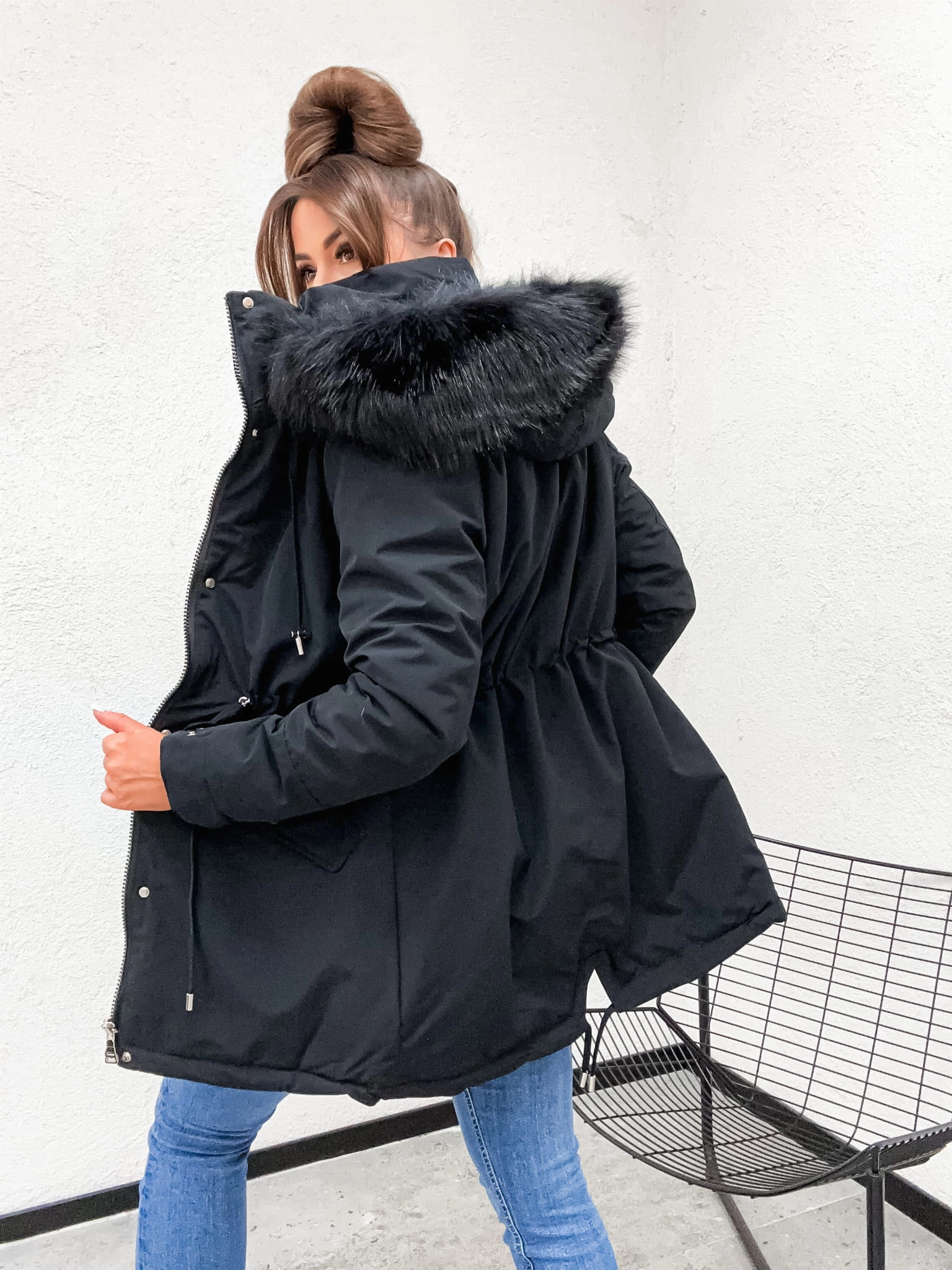 Parka zimowa damska na misiu (Teddy) z kapturem – Ciepła kurtka W641 - czarna