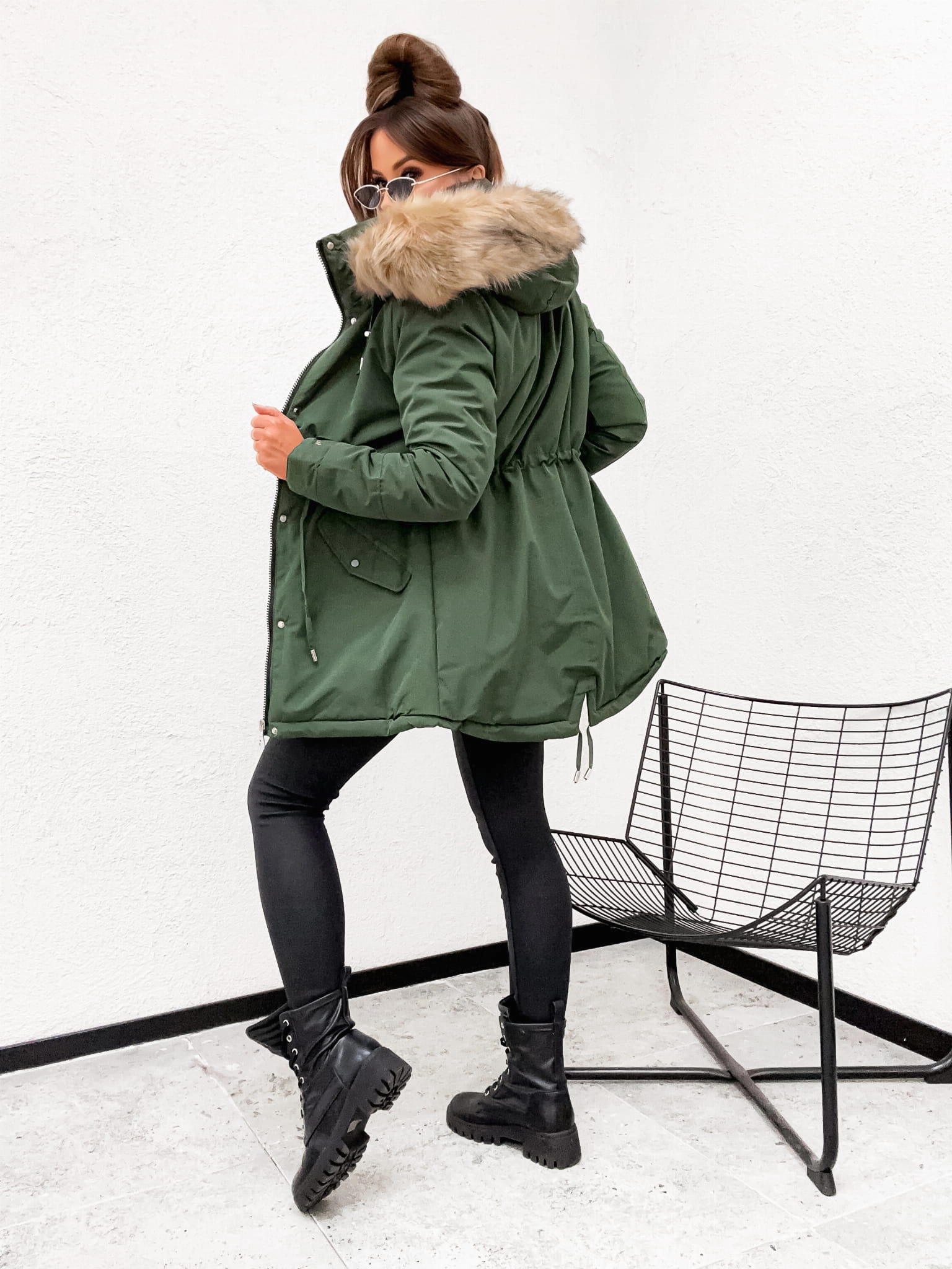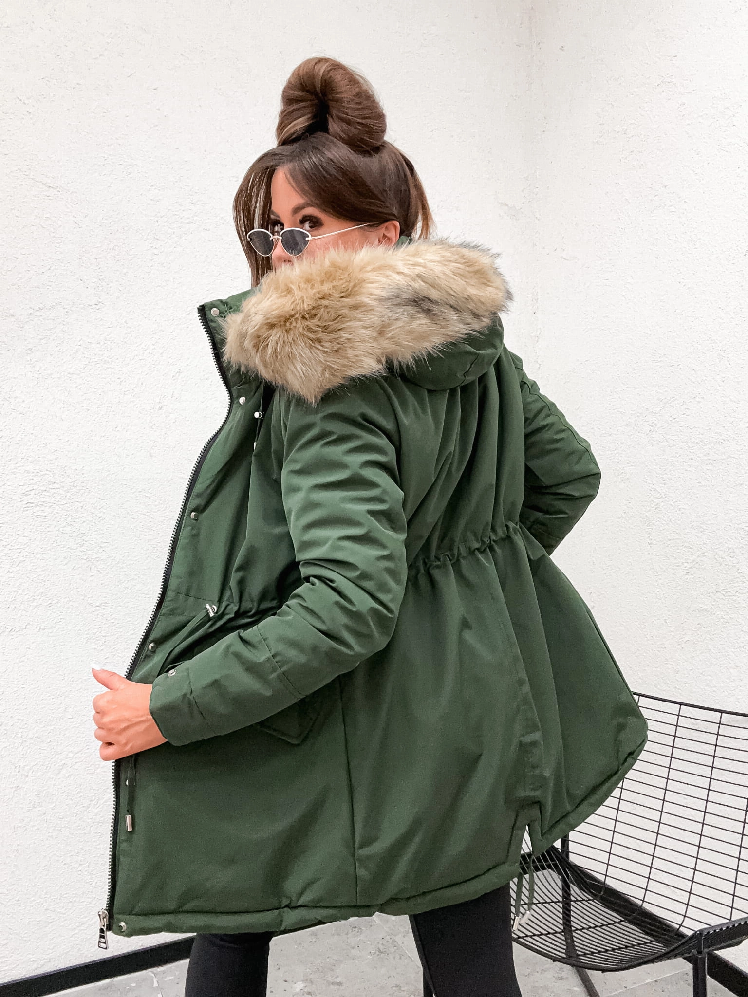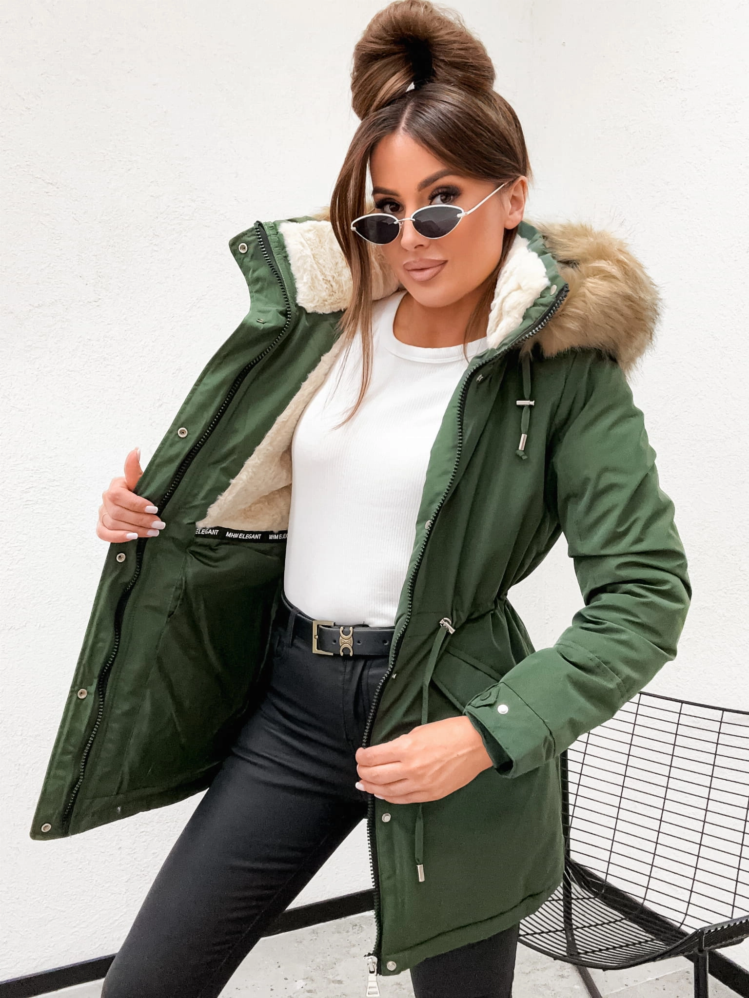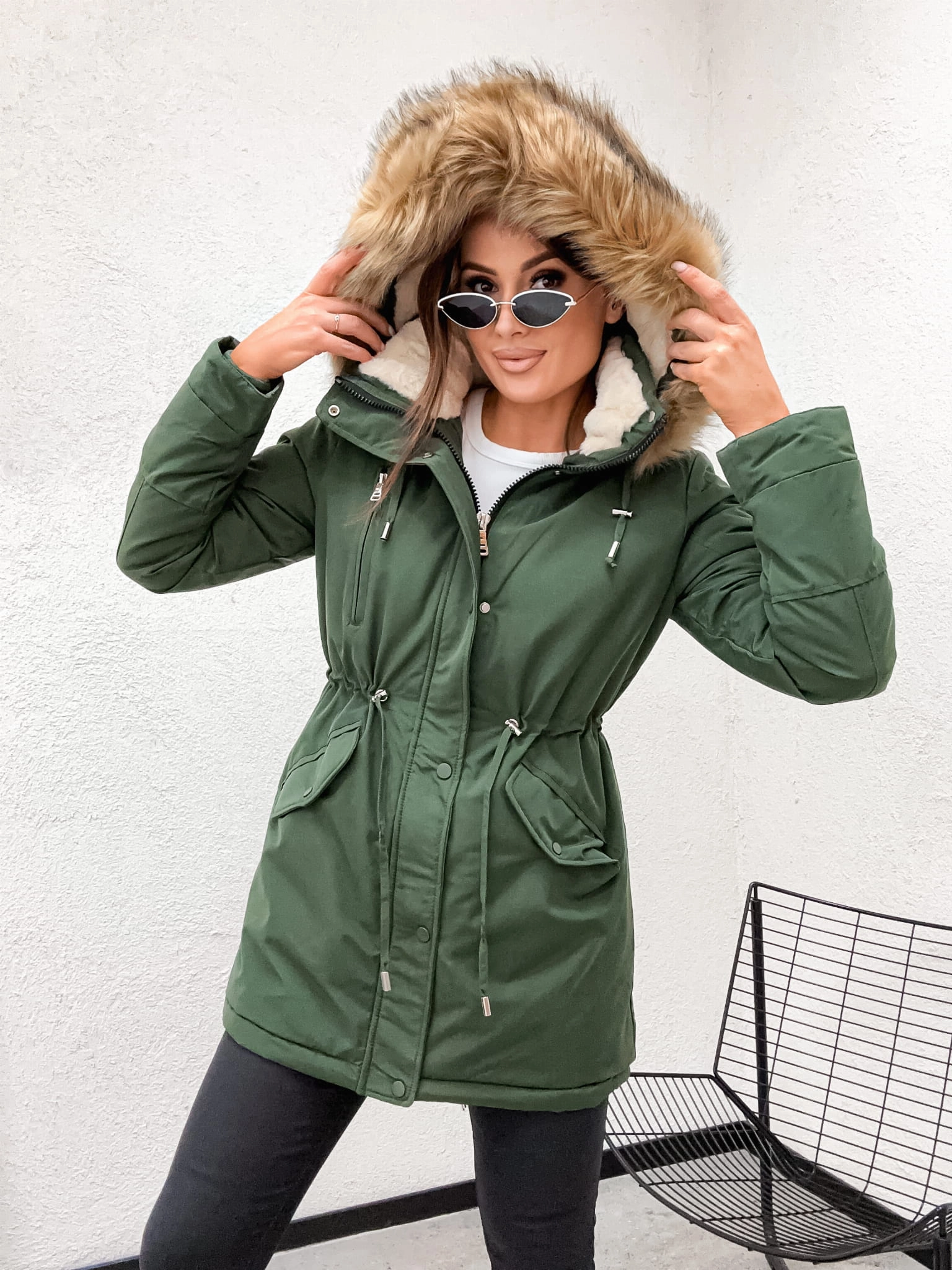 Parka zimowa damska na misiu (Teddy) z kapturem – Ciepła kurtka W641 - zielona