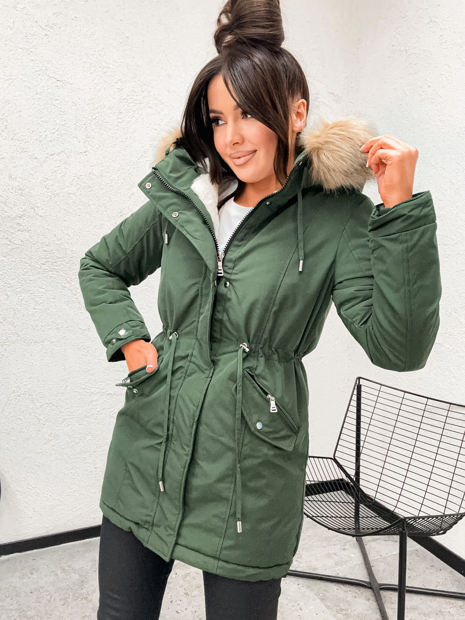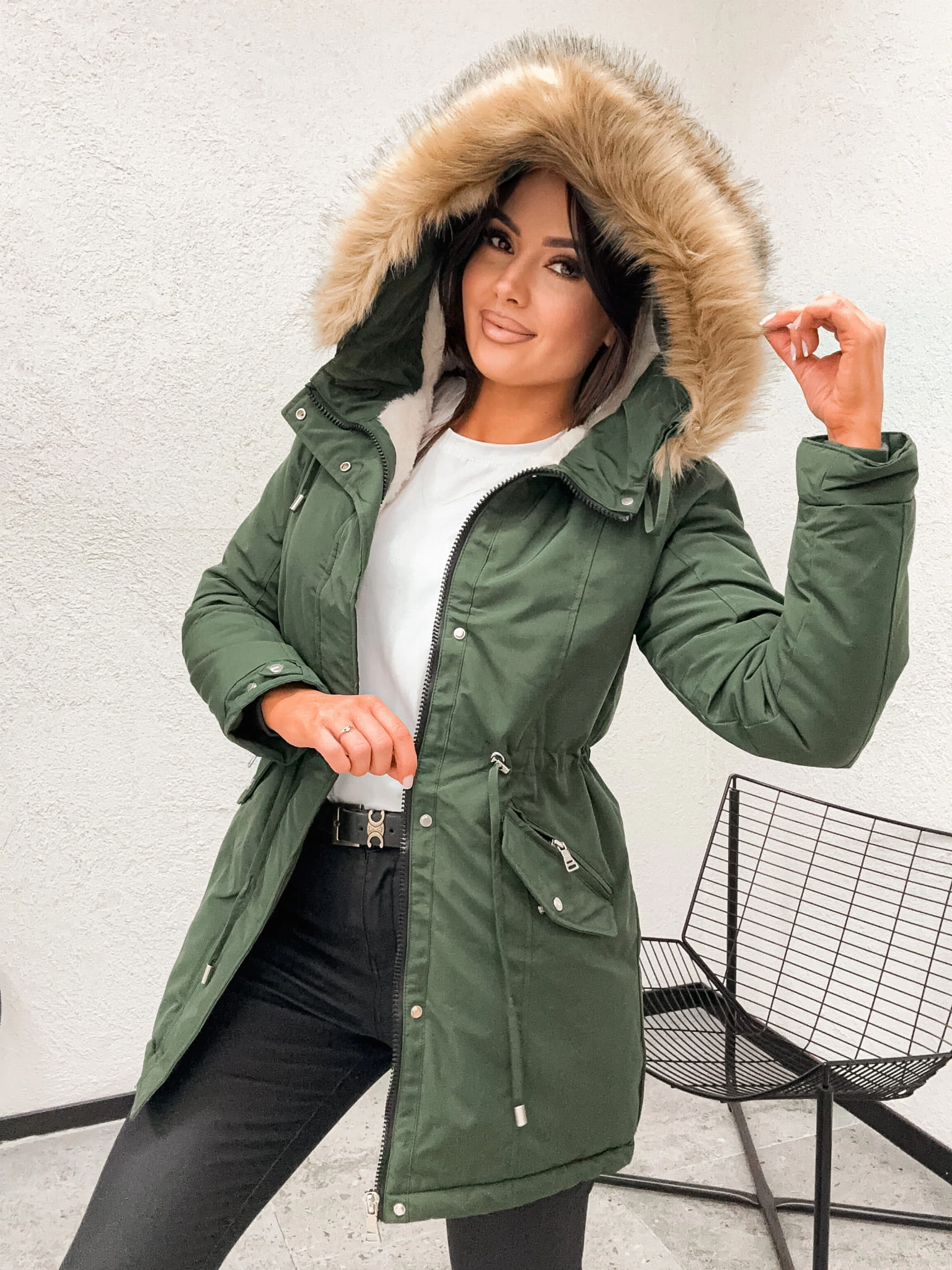 Zimowa ciepla kurtka damska PARKA z kapturem W611 - ARMY GREEN