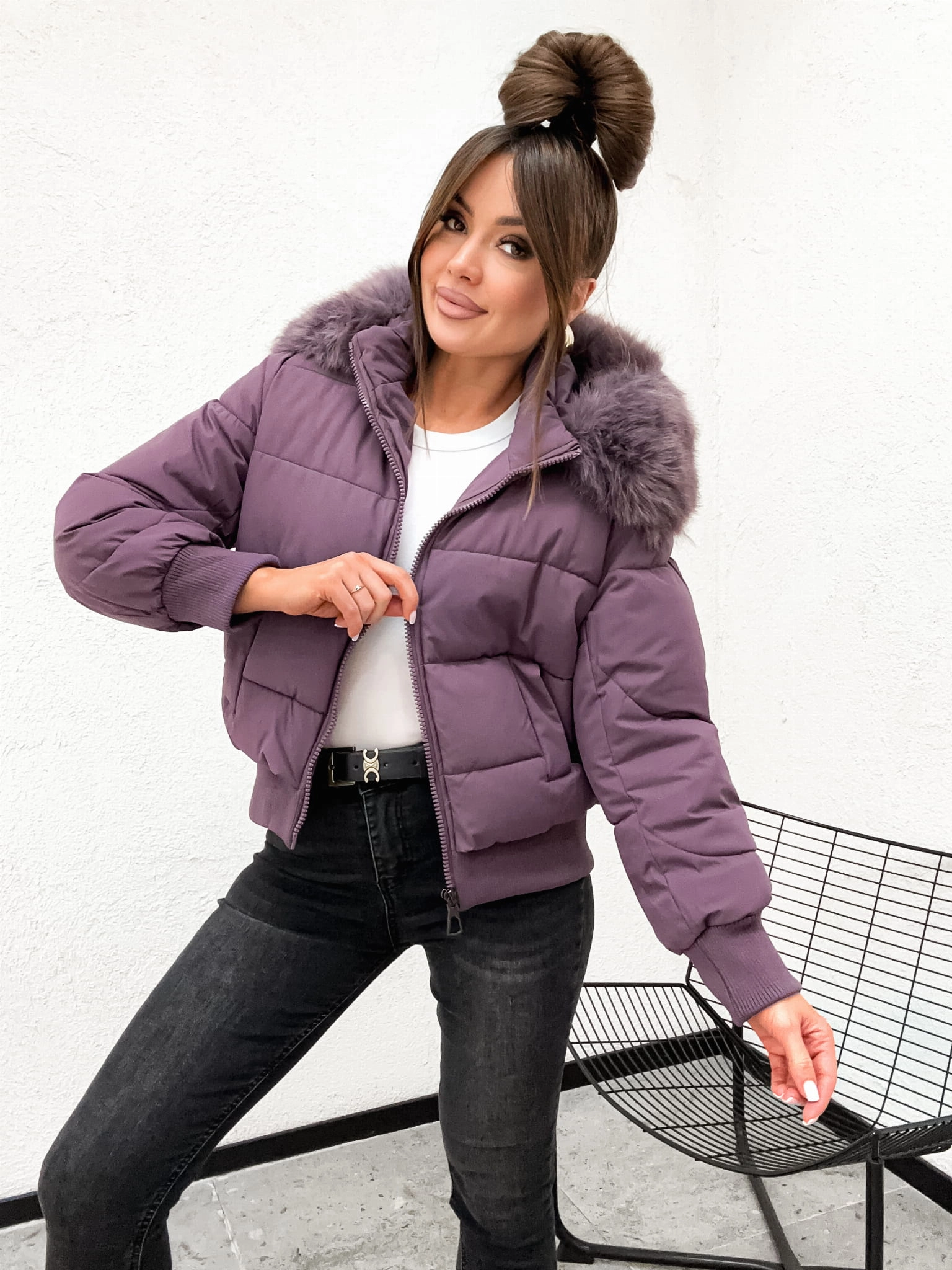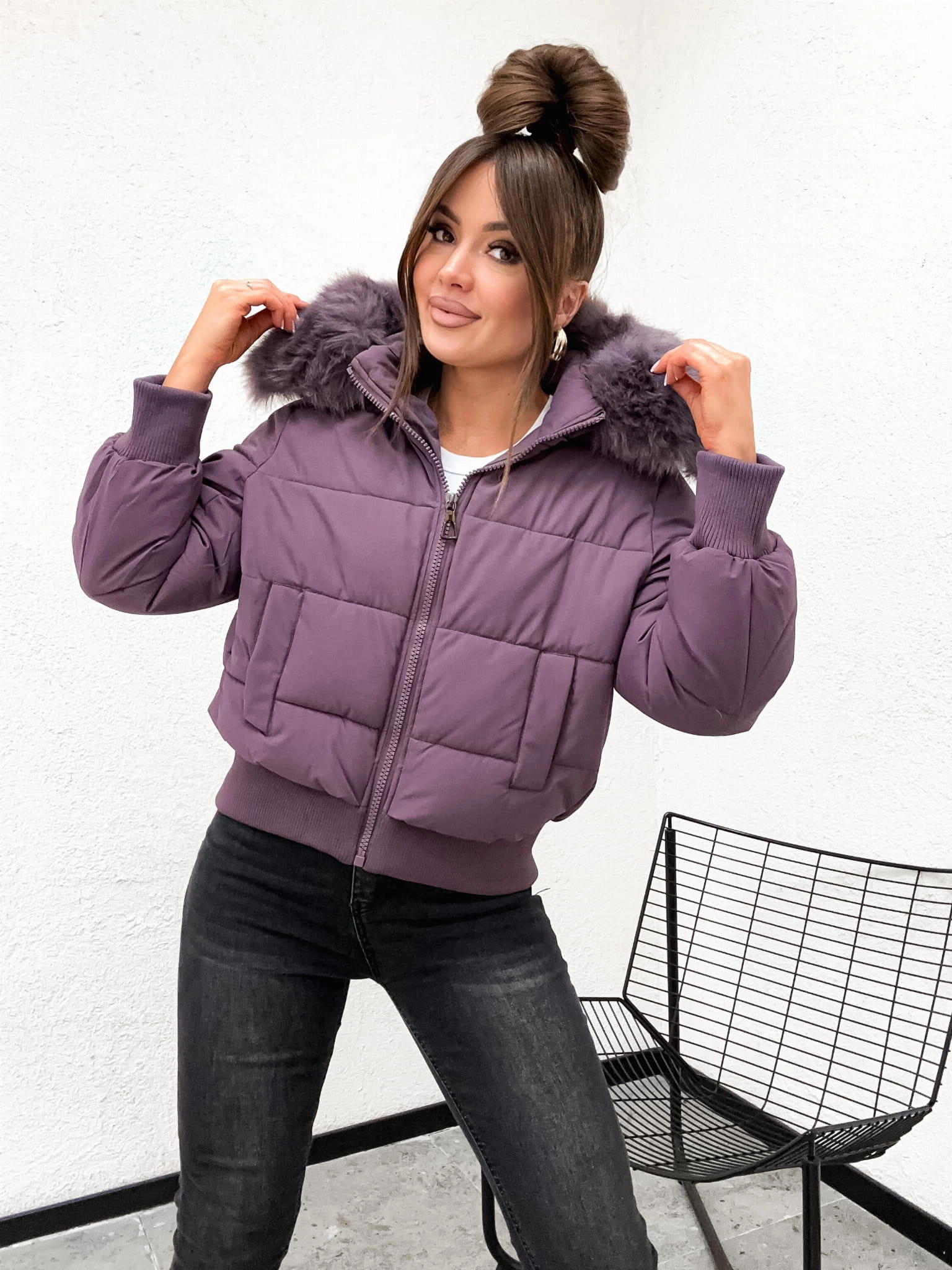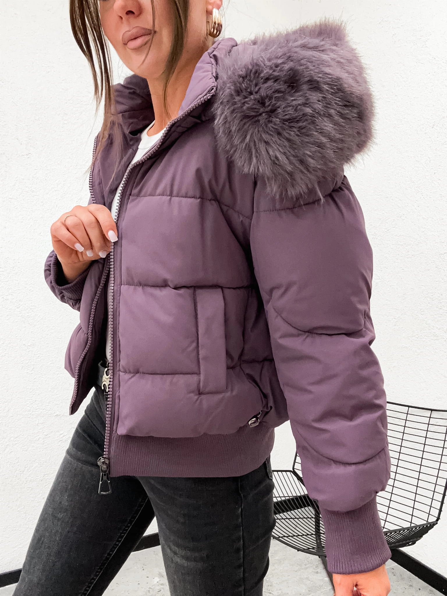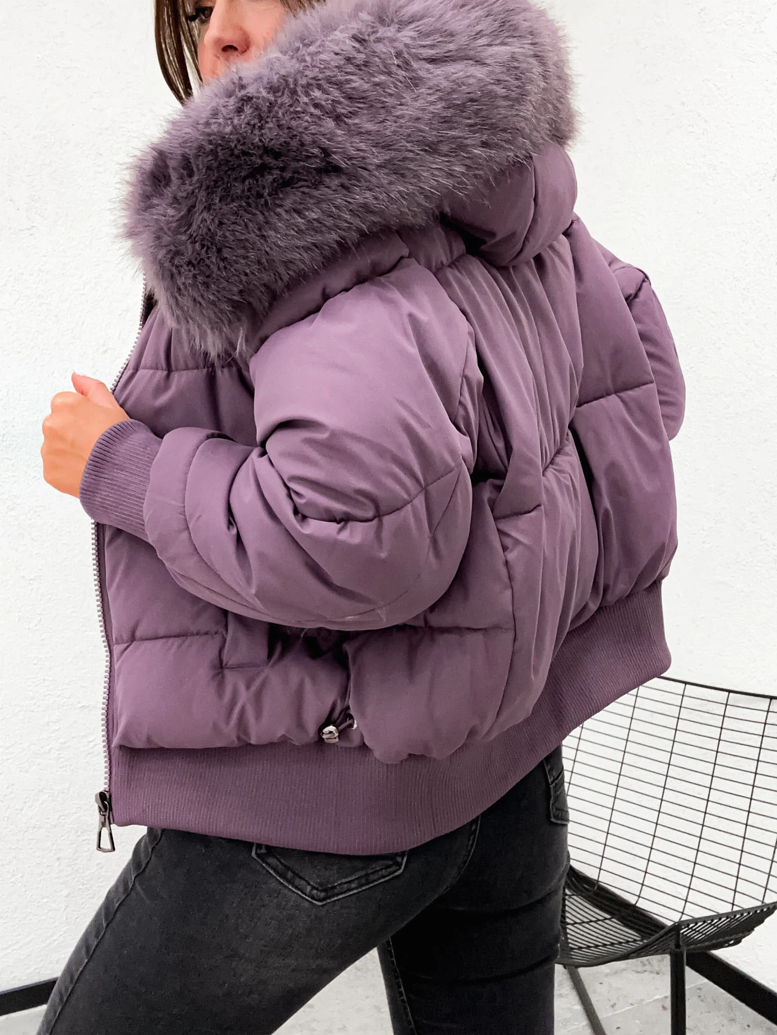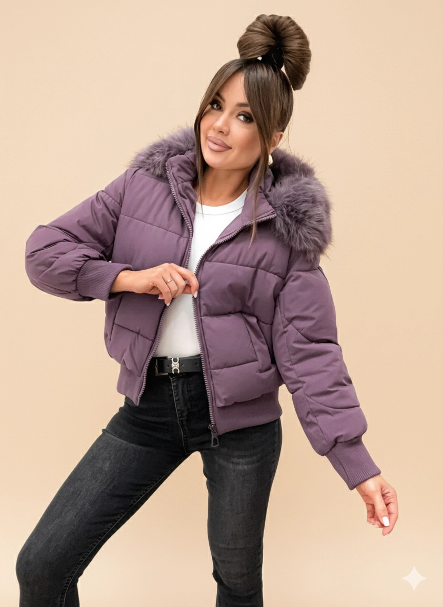 Zimowa pikowana kurtka damska z kapturem OVERSIZE 8288 - FIOLET